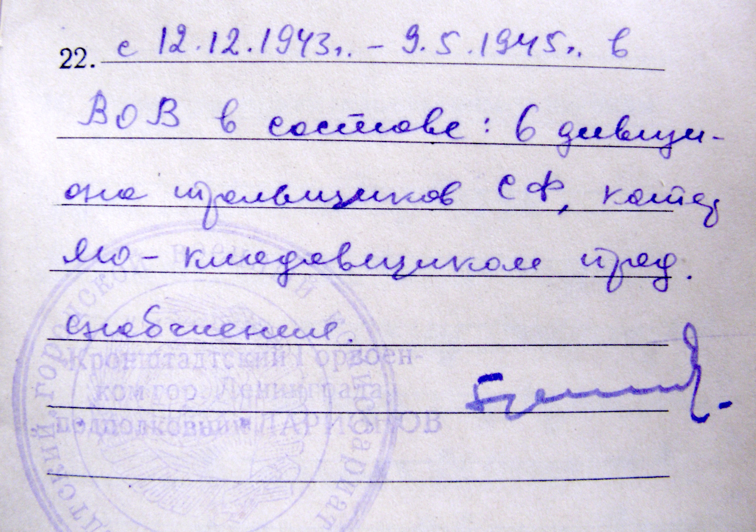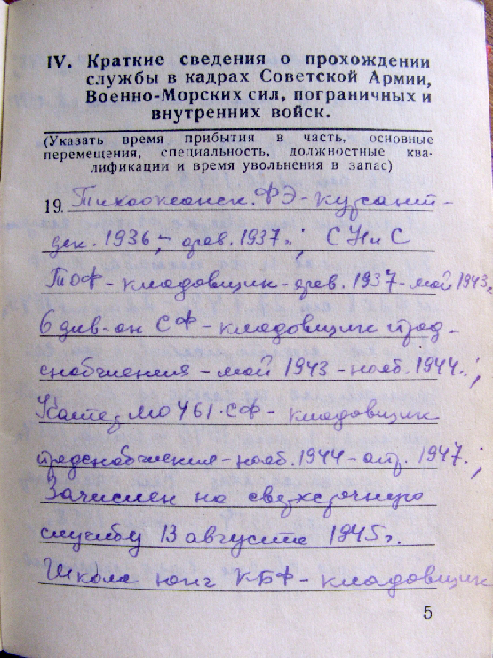 Краткие сведения о прохождении службы в кадрах Советской Армии, Военно-морских сил, пограничных и внутренних войск (указать время прибытия в часть, основные перемещения, специальность, должностные квалификации и время увольнения в запас): тихоокеанский ФЭ - курсант - декабрь 1936 г. - февраль 1937 г., СНиС ТОФ - кладовщик - февраль 1937 г. - май 1943 г., 6 дивизин СФ - кладовщик прод. снабжения - май 1943 г. - ноябрь 1944 г., катер МО 461 СФ - кладовщик прод. снабжения - ноябрь 1944 г. - апрель 1947 г. Зачислен на сверхсрочную службу 13 августа 1945 г. Школа юнг КБФ - кладовщик.