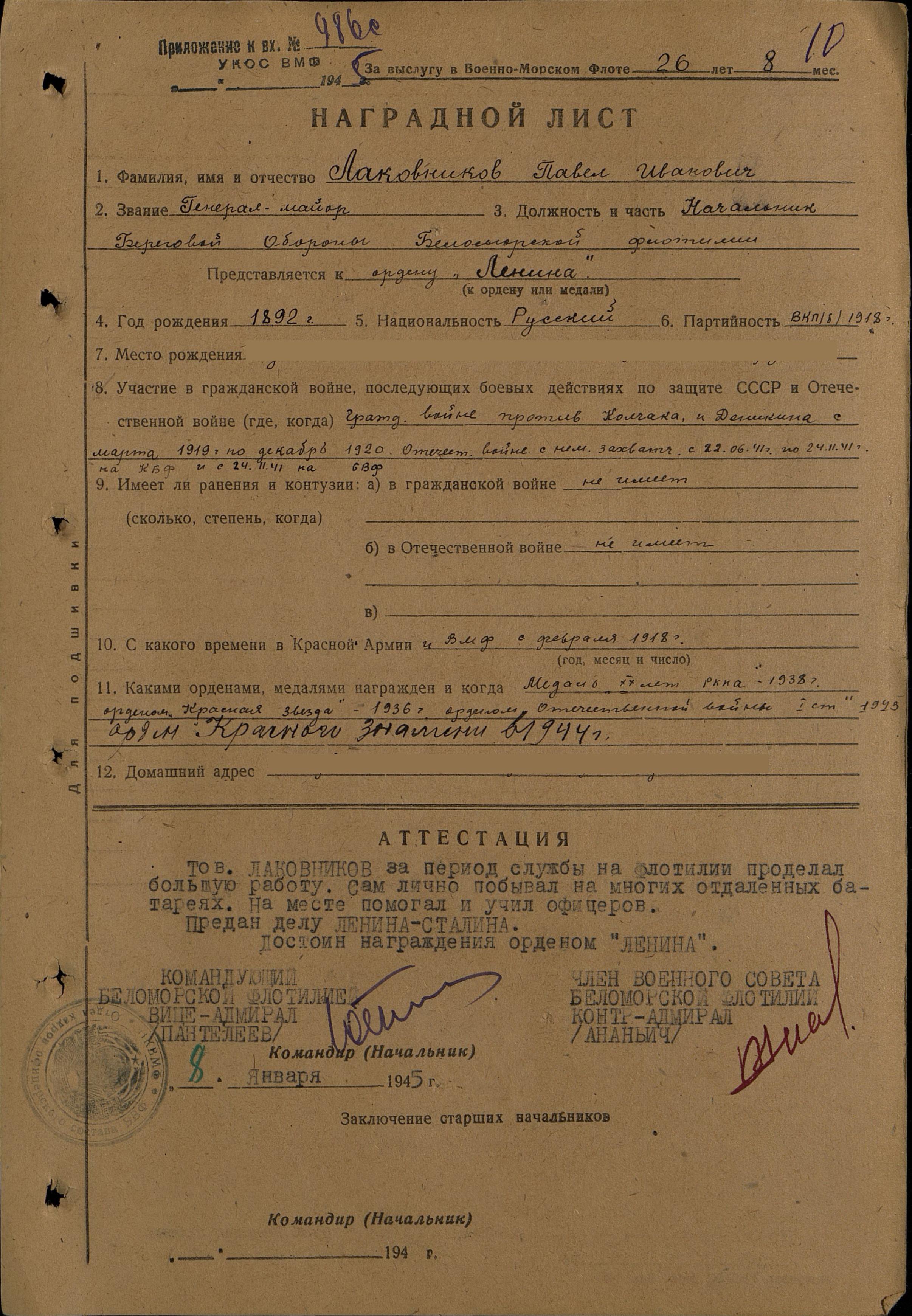 http://ke.culture51.ru/Lakovnikov-Pavel ... p4437.htmlЛаковников Павел Иванович [15(27).12.1892, с. Брусяны ныне Самарской обл. – 12.04.1973, г. Москва], сов. военачальник, генерал-майор артиллерии (1941). Окончил Кронштадтскую школу комендоров (1914), Высшую артиллерийскую школу (1925, г. Пушкин), класс береговой артиллерии спец. курсов ВМС РККА (1930). С 1914 – комендор крейсера «Диана» Балт. флота. В янв. 1918 – окт. 1924 – старшина крейсера «Диана», политком конной разведки 221-го стрелк. п., старшина артиллерии канонерской лодки «Буйный» Волжской воен. флотилии, ком. арт. бат. в Красноводске, в Новороссийской арт. группе, ком. дивизиона в Сев.-Кавказском р-не. С 1925 – ком. 1-й группы береговой артиллерии Крымского р-на береговой обороны (БО), с 1926 – ком. 2-го, 42-го артдивизионов, с 1930 – ком. и военком Батумского р-на БО, с 1932 – пом. флагманского артиллериста, с 1934 – пом. нач. Отдела боевой подготовки и пом. флагарта штаба, с 1935 – пом. коменданта Сев.-Зап. укрепрайона по артиллерии Мор. сил Черного м. С июня 1935 – комендант Мурманского укрепленного района СФ. В июне 1938 репрессирован как «участник военного заговора на СФ», в янв. 1940 восстановлен в кадрах ВМФ. С 1940 – комендант Зап., комендант Кронштадтского сектора БО Гл. базы БФ. С июля 1941 – комендант Ижорского укрепрайона. С нояб. 1941 – пом. команд. Беломор. воен. флотилией по БО и сухопутным войскам, с янв. 1943 – нач. Упр. БО БВФ СФ. С окт. 1944 – комендант Хасанского сектора БО ТОФ, с 1945 – нач. БО Юж. мор. оборонительного р-на (МОР), комендант БО Сахалинской воен. флотилии, с 1946 – комендант БО Владивостокского МОР, с 1947 – Островного МОР ТОФ. С 1947 – нач. 2-го мор. арсенала ВМС, с 1951 – инспектор, ст. инспектор Гл. инспекции ВМС. Участник 1-й мировой (1914–1918), Гражд. войн, воевал против войск А. В. Колчака и П. Н. Врангеля, участвовал в Вел. Отеч. (1941–1945) и сов.-япон. (1945) войнах. Руководитель создания и обеспечения береговой обороны Кольского п-ова в годы Вел. Отеч. войны. Руководитель и участник конвойных операций СФ. Награжден орденами Ленина (1945), Красного Знамени (1944, 1948), Отечественной войны I ст. (1943), Красной Звезды (1935), медалью «За оборону Советского Заполярья» и др., именным оружием.