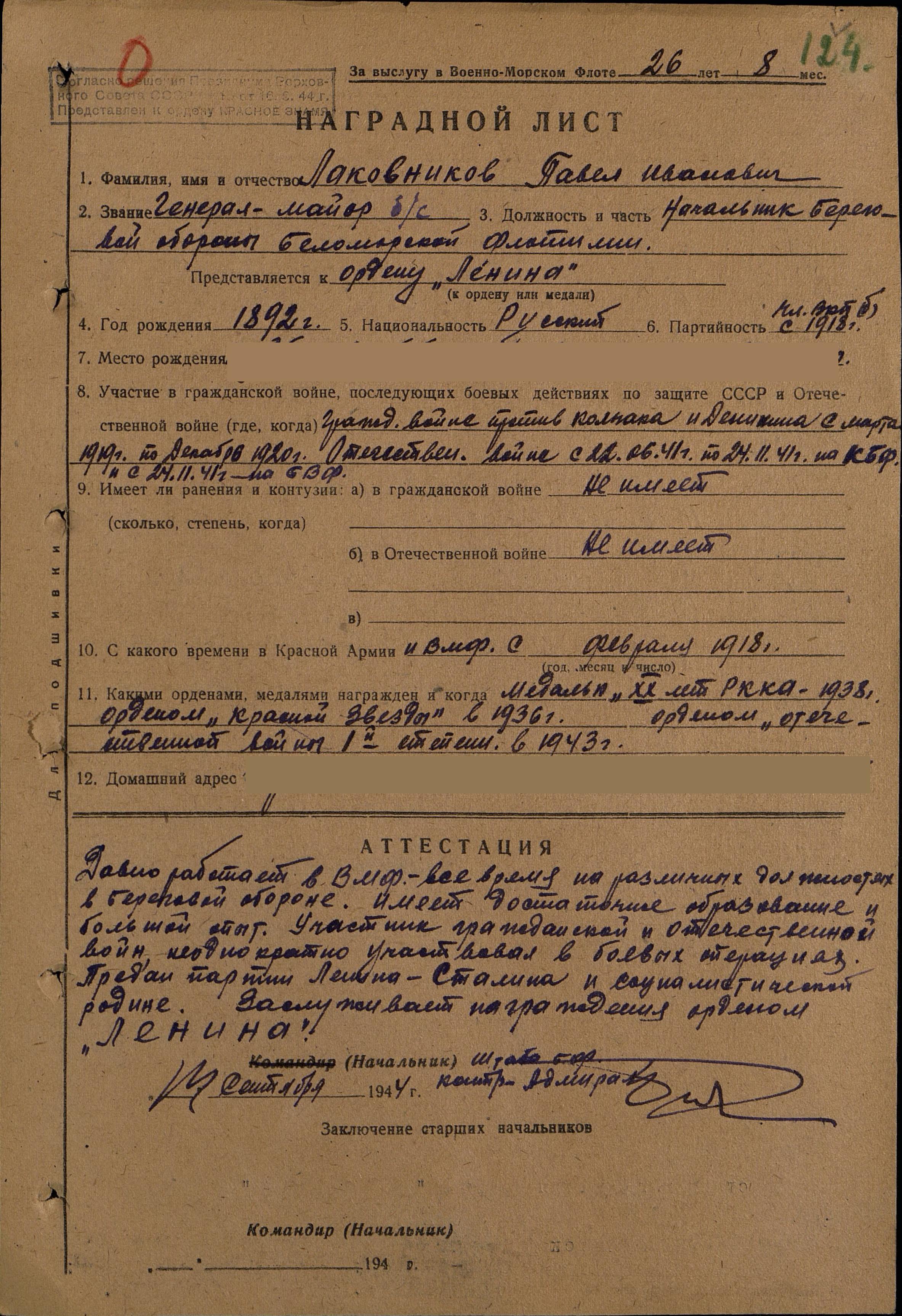 http://ke.culture51.ru/Lakovnikov-Pavel ... p4437.htmlЛаковников Павел Иванович [15(27).12.1892, с. Брусяны ныне Самарской обл. – 12.04.1973, г. Москва], сов. военачальник, генерал-майор артиллерии (1941). Окончил Кронштадтскую школу комендоров (1914), Высшую артиллерийскую школу (1925, г. Пушкин), класс береговой артиллерии спец. курсов ВМС РККА (1930). С 1914 – комендор крейсера «Диана» Балт. флота. В янв. 1918 – окт. 1924 – старшина крейсера «Диана», политком конной разведки 221-го стрелк. п., старшина артиллерии канонерской лодки «Буйный» Волжской воен. флотилии, ком. арт. бат. в Красноводске, в Новороссийской арт. группе, ком. дивизиона в Сев.-Кавказском р-не. С 1925 – ком. 1-й группы береговой артиллерии Крымского р-на береговой обороны (БО), с 1926 – ком. 2-го, 42-го артдивизионов, с 1930 – ком. и военком Батумского р-на БО, с 1932 – пом. флагманского артиллериста, с 1934 – пом. нач. Отдела боевой подготовки и пом. флагарта штаба, с 1935 – пом. коменданта Сев.-Зап. укрепрайона по артиллерии Мор. сил Черного м. С июня 1935 – комендант Мурманского укрепленного района СФ. В июне 1938 репрессирован как «участник военного заговора на СФ», в янв. 1940 восстановлен в кадрах ВМФ. С 1940 – комендант Зап., комендант Кронштадтского сектора БО Гл. базы БФ. С июля 1941 – комендант Ижорского укрепрайона. С нояб. 1941 – пом. команд. Беломор. воен. флотилией по БО и сухопутным войскам, с янв. 1943 – нач. Упр. БО БВФ СФ. С окт. 1944 – комендант Хасанского сектора БО ТОФ, с 1945 – нач. БО Юж. мор. оборонительного р-на (МОР), комендант БО Сахалинской воен. флотилии, с 1946 – комендант БО Владивостокского МОР, с 1947 – Островного МОР ТОФ. С 1947 – нач. 2-го мор. арсенала ВМС, с 1951 – инспектор, ст. инспектор Гл. инспекции ВМС. Участник 1-й мировой (1914–1918), Гражд. войн, воевал против войск А. В. Колчака и П. Н. Врангеля, участвовал в Вел. Отеч. (1941–1945) и сов.-япон. (1945) войнах. Руководитель создания и обеспечения береговой обороны Кольского п-ова в годы Вел. Отеч. войны. Руководитель и участник конвойных операций СФ. Награжден орденами Ленина (1945), Красного Знамени (1944, 1948), Отечественной войны I ст. (1943), Красной Звезды (1935), медалью «За оборону Советского Заполярья» и др., именным оружием.