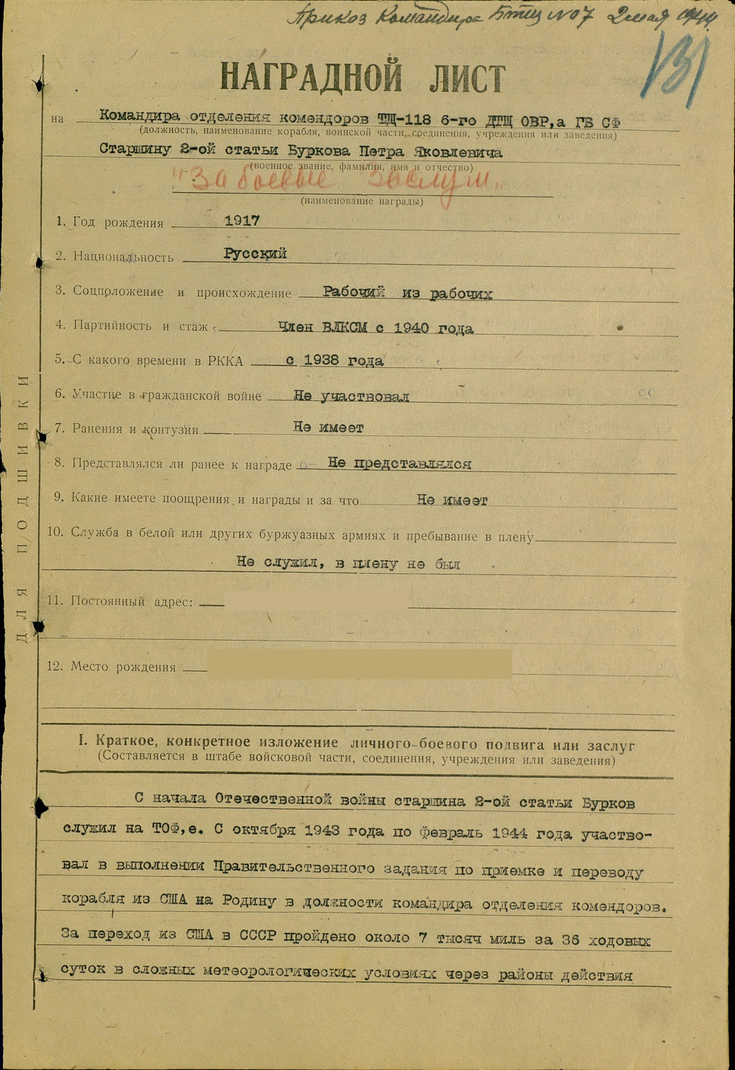 Во всех операциях и переходах старшина 2 статьи Бурков обеспечил немедленную готовность боевой техники к действию, стойко и бдительно нес боевую вахту, обеспечивая тем самым успешное выполнение боевых заданий командования.