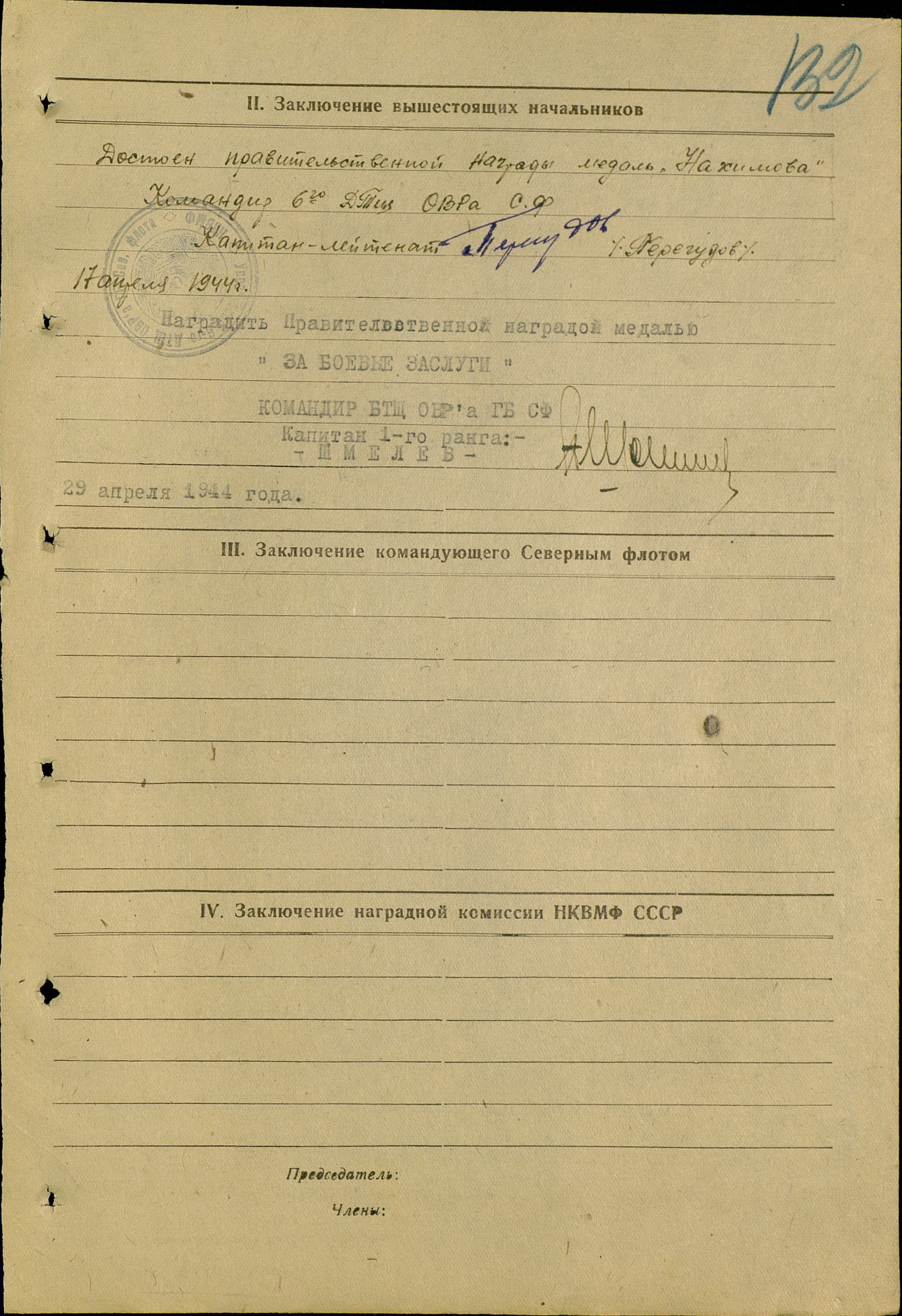 За успешное выполнение правительственного задания и боевых заданий командования в борьбе против немецко-фашистских захватчиков представляю к правительственной награде – медали Нахимова.