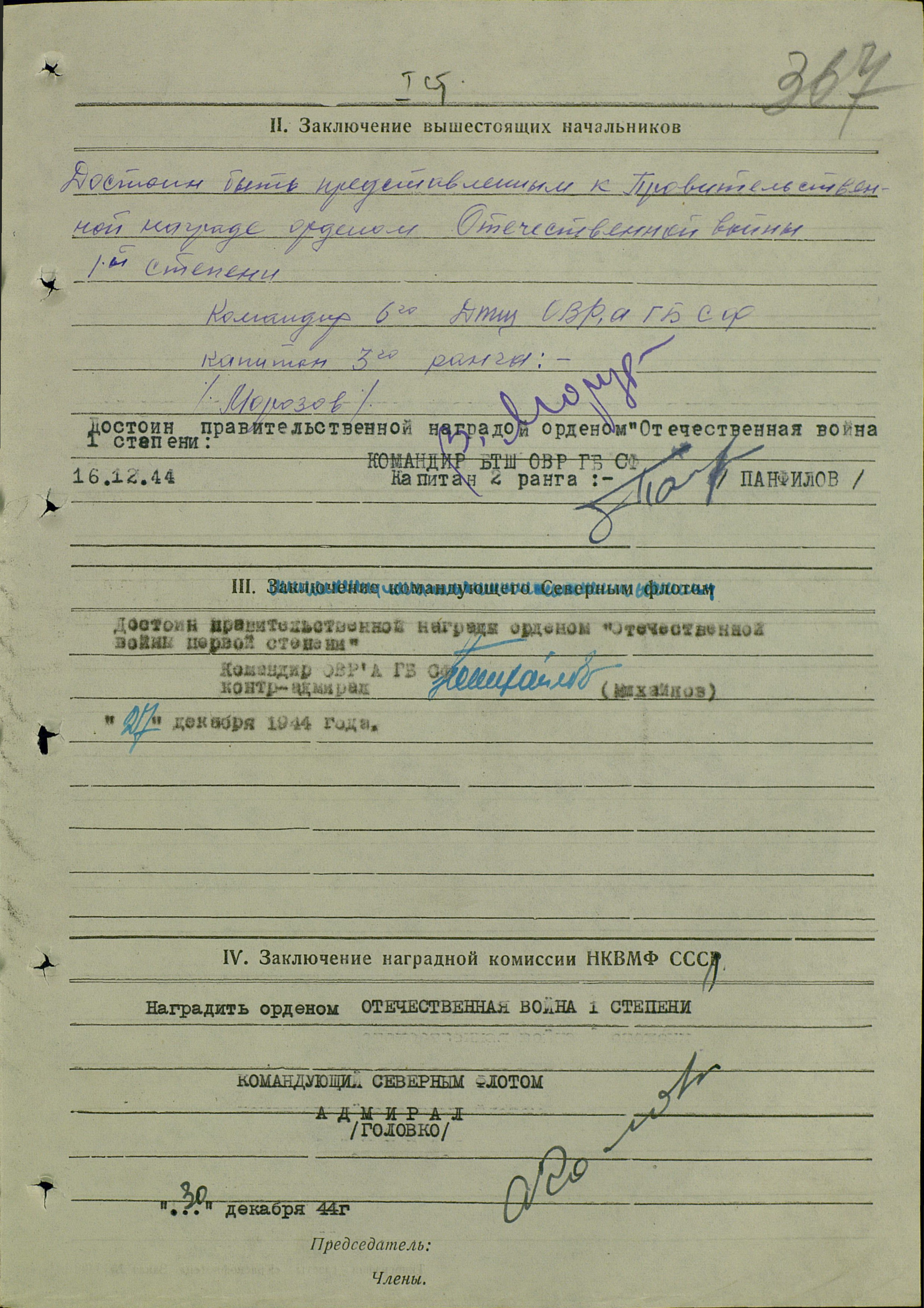 Старшина 2 статьи Борисов принимает участие в Отечественной войне с 1941 г. на кораблях СФ. На ТЩ-116 служит с момента его постройки и участвует во всех боевых походах корабля. Только с 1 декабря 1944 г. кораблем выполнено 44 боевых задания, пройдено 5256 миль, из них с тралом 531 миля, отконвоирован 71 транспорт, отражено при этом 12 атак ПЛ и одна из них потоплена. Во время выполнения всех вышеперечисленных боевых заданий корабль всегда имел хорошую связь с базами и флагманами. Тов. Борисов заслуженно является лучшим командиром отделения на корабле, он умело сочетанем (?) богатого боевого опыта, учит своих подчиненных краснофлотцев, которые за короткий период времени стали отличными специалистами. Во время боевого траления у борта корабля взорвалась мина, от взрыва которой вышел из строя коротковолновый радиоприемник, тов. Борисов быстро устранил повреждения и через несколько минут командир снова мог пользоваться радиосвязью. Во время потопления вражеской ПЛ тов. Борисов находился на своем боевом посту в радиорубке и осуществлял связь с базой и флагманами. От взрыва мин вышел из строя боевой радиоприемник, тов. Борисов дал правильные указания подчиненному краснофлотцу, который быстро устранил повреждения, а сам перешел работать на запасной (радиоприемник – C.Ш.).
