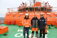 На фоне атомохода с флагами экспедиции.