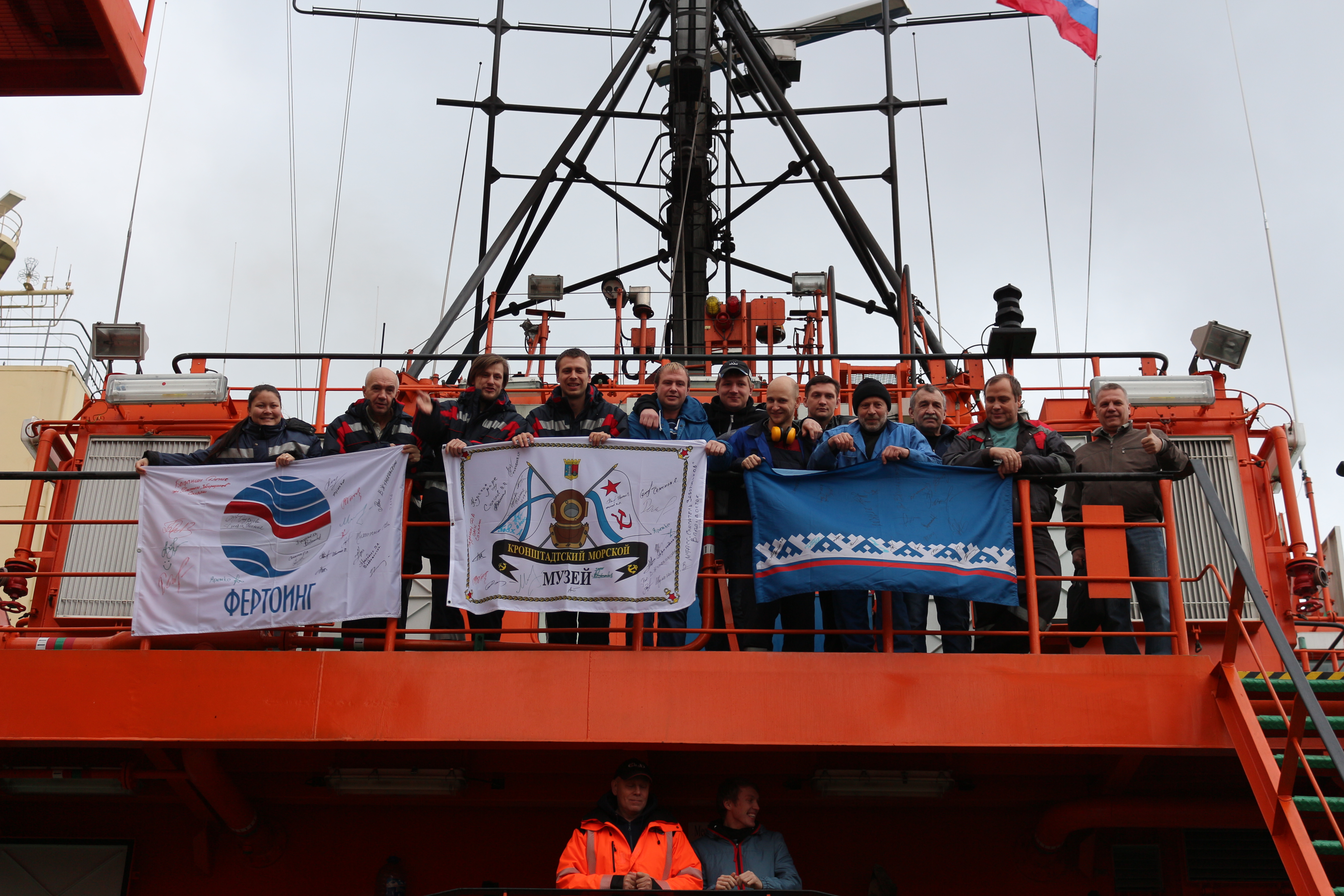 Команда с флагами экспедиции на рубке.