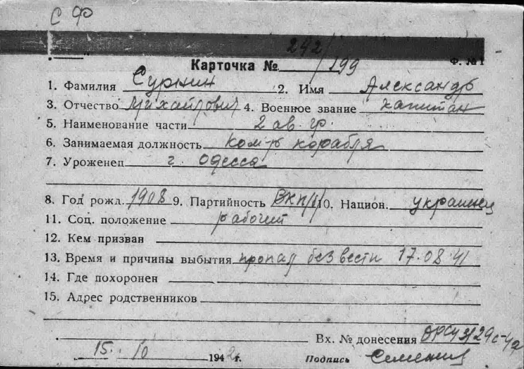 погиб 24.08.41. при катастрофе в районе Баренцева моря