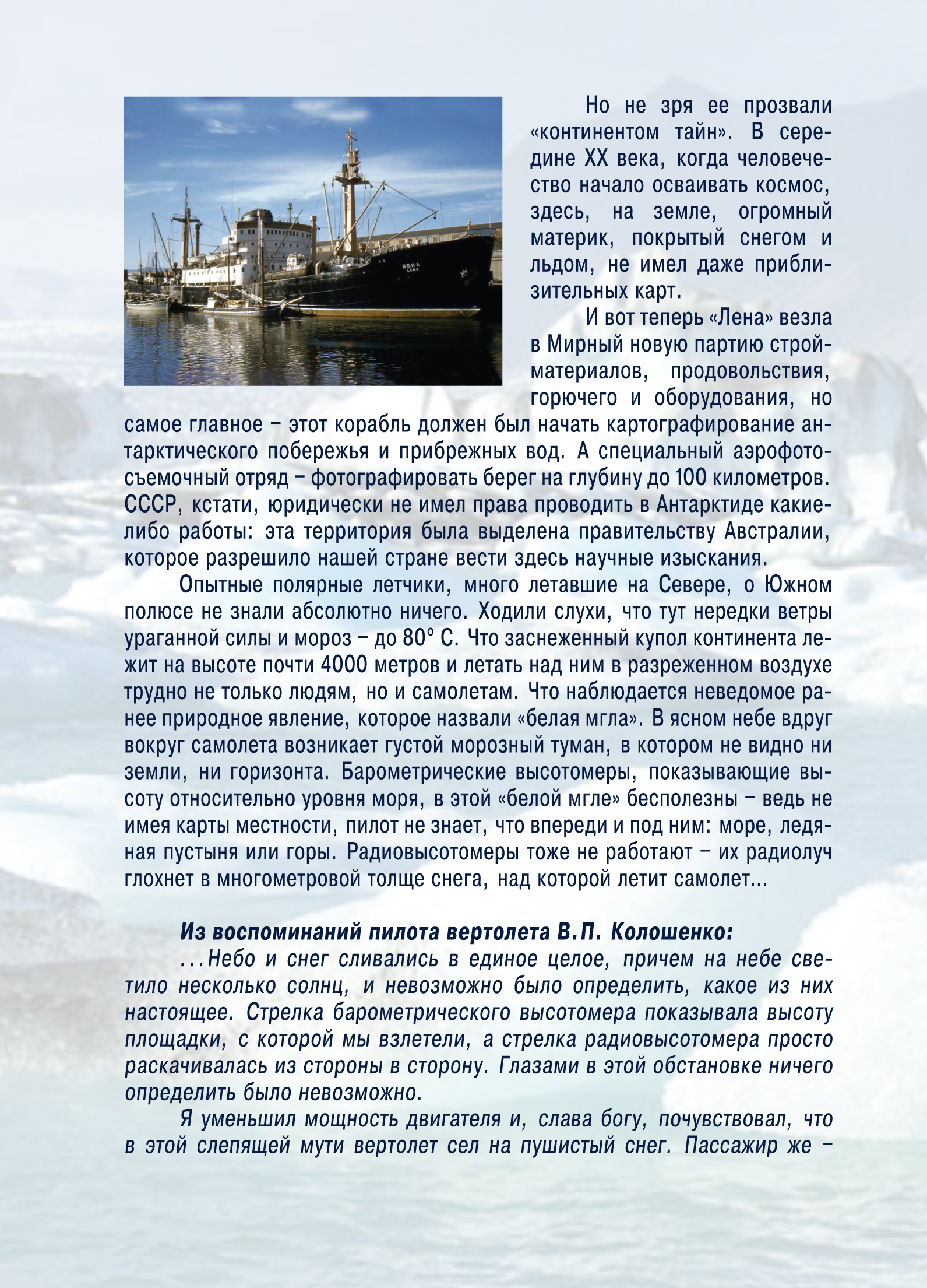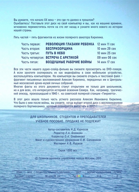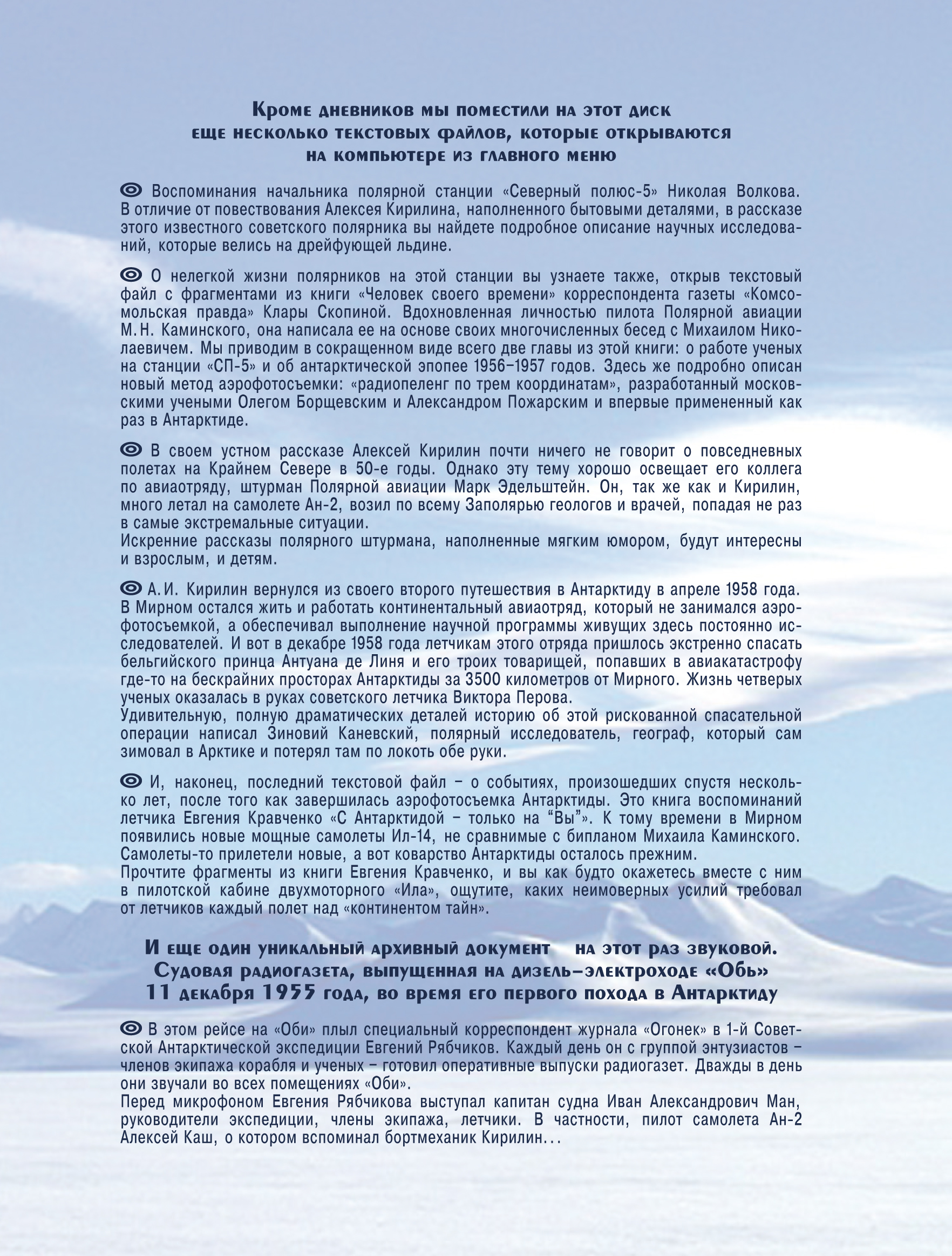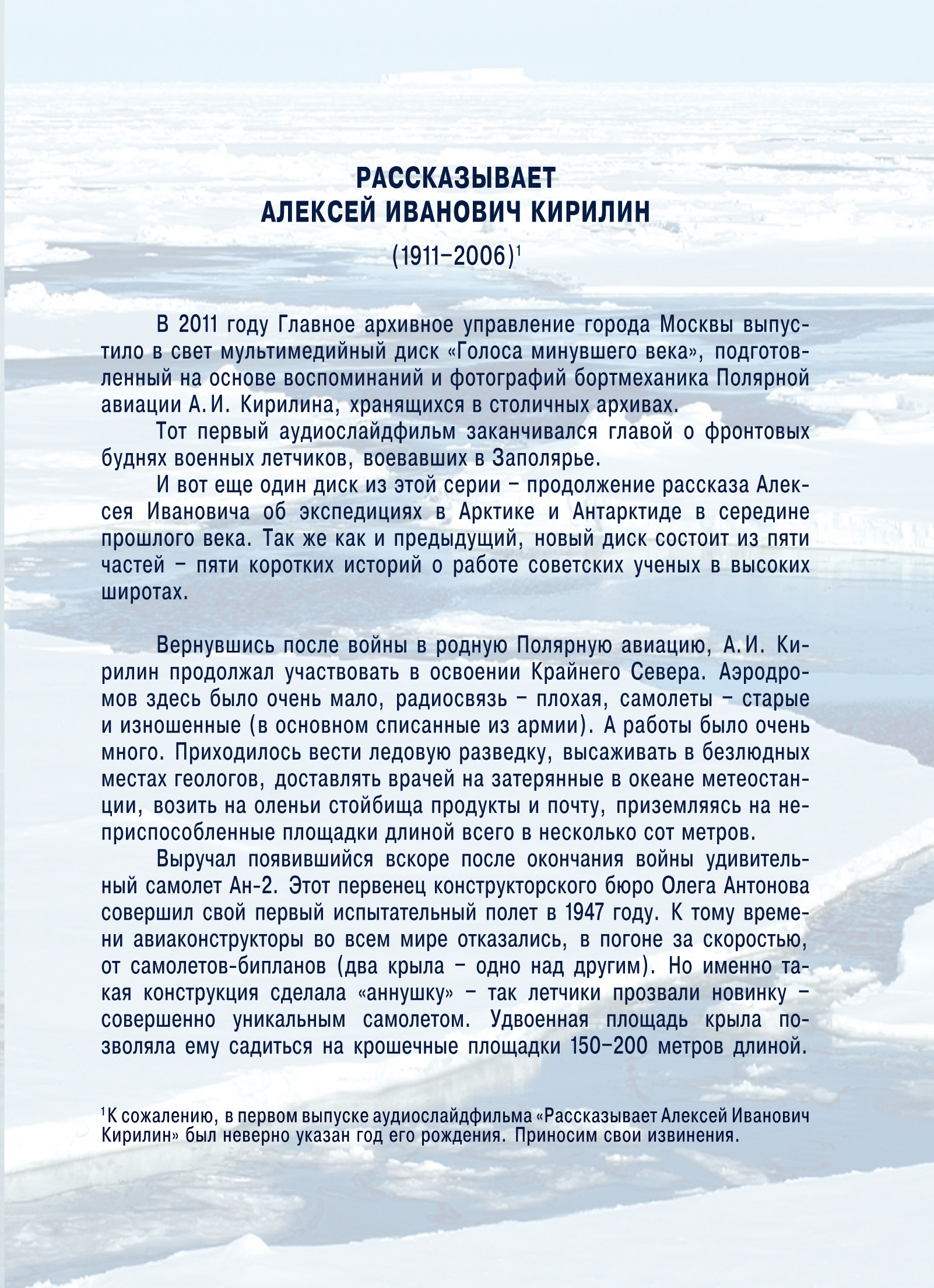 И вот, новый диск из этой серии – продолжение рассказа Алексея Ивановича о его послевоенной биографии. О полетах на Севере, об освоении Арктики и Антарктики в середине прошлого века. Также как и предыдущий, этот диск содержит пять видеофайлов – пять коротких аудиослайдфильмов о работе на Северном и Южном полюсах. Но кроме них мы поместили на новый диск один звуковой файл и семь текстовых. И все они – о полетах в высоких широтах и нелегкой работе наших ученых по изучению полярных материков...