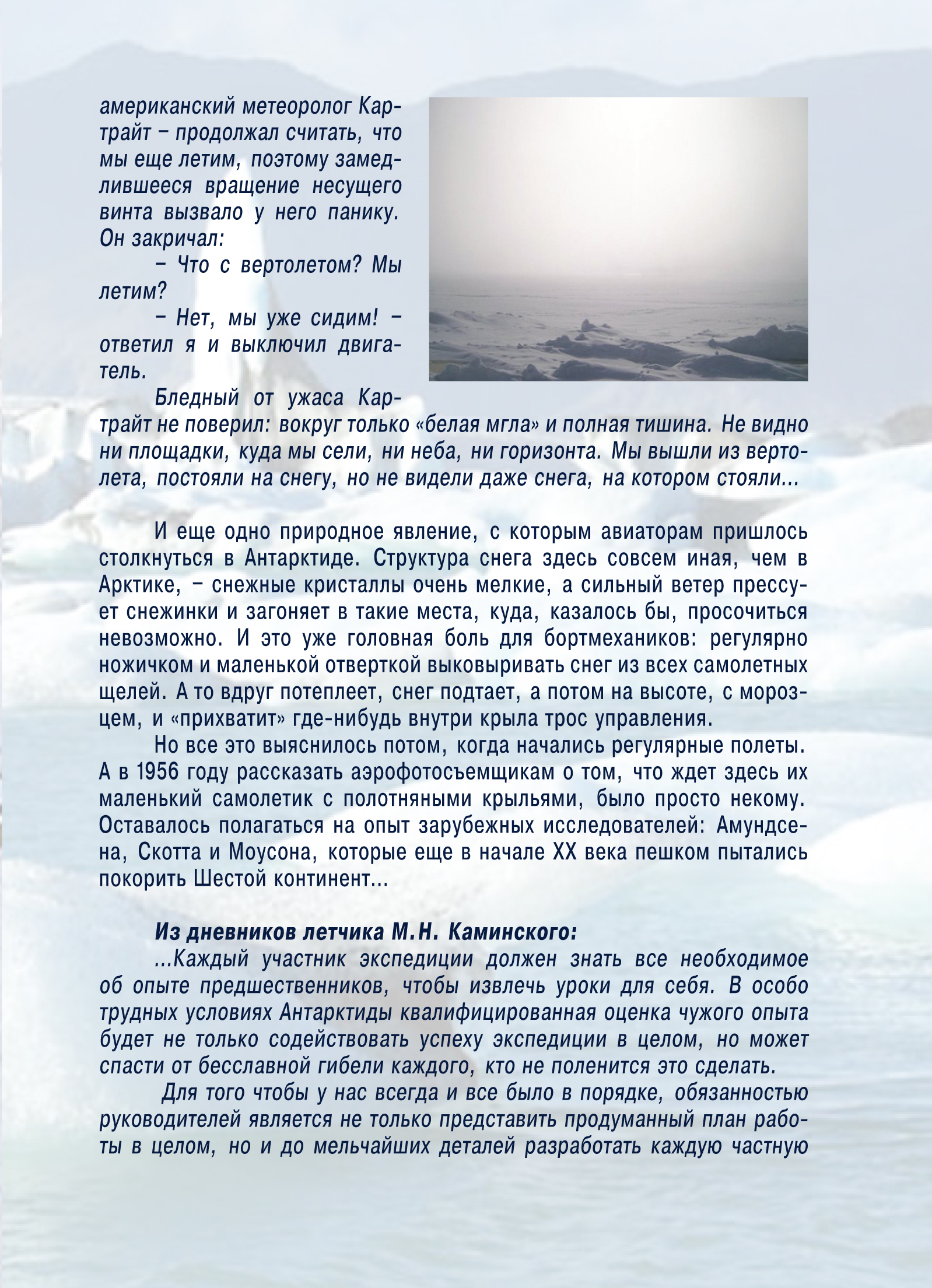 Всю полярную ночь с летчиком Каминским вели дежурство, и каждую неделю, несмотря на сильные морозы и темноту – с кострами, как на войне у партизан, вылетев, бросали посадочную парашютную осветительную шашку и вели осмотр «СП-5». А льдина, обламываясь, все уменьшалась. Но, несмотря на это, ученые вели непрерывно свои программные наблюдения, зная, что в беде не останутся, что здесь дежурит вертолет и самолет.