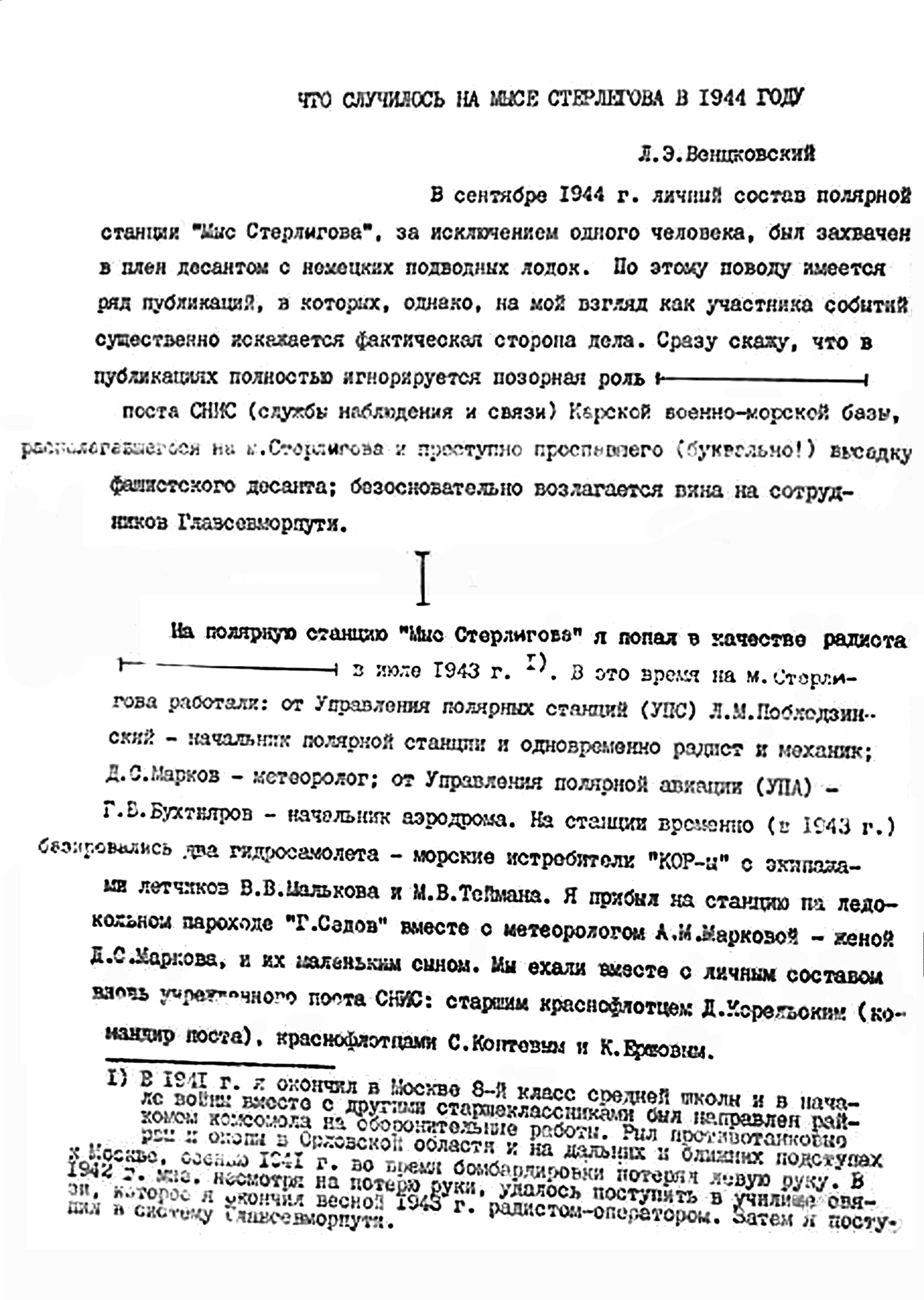 В сентябре 1944 г. личный состав полярной станции "Мыс Стерлигова", за исключением одного человека, был захвачен в плен десантом с немецких подводных лодок. По этому поводу имеется ряд публикаций, в которых, однако, на мой взгляд как участника событий, существенно искажается фактическая сторона дела. Сразу сказу, что в публикациях полностью игнорируется позорная роль (часть строки вымарана) поста СНИС (службы наблюдения и связи) Карской военно-морской базы, располагавшейся на м.Стерлигова и преступно проспавшего (буквально!) высадку фашистского десанта; безосновательно возлагается вина на сотрудников Главсевморпути.
