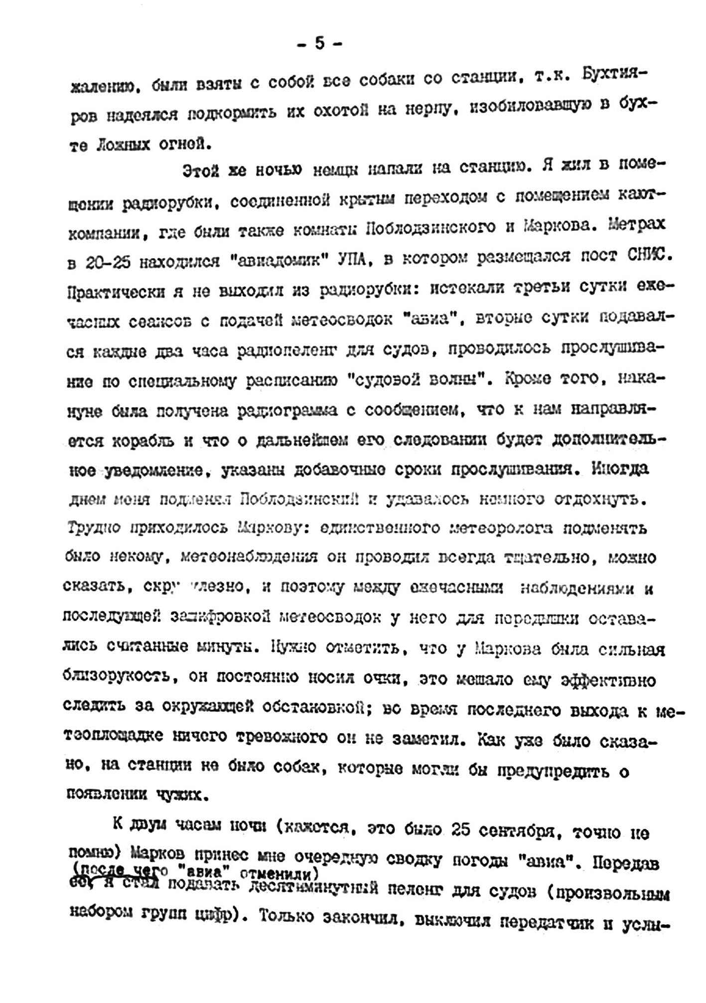 Этой же ночью немцы напали на станцию. Я жил в помещении радиорубки, соединенной крытым переходом с помещением кают-компании, где были также комнаты Поблодзинского и Маркова. Метрах в 20-25 находился "авиадомик" УПА, в котором размещался пост СНИС. Практически я не выходил из радиорубки: истекали третьи сутки ежечасных сеансов с подачей метеосводок "авиа", вторые сутки подавался каждые два часа радиопеленг для судов, проводилось прослушивание по специальному расписанию "судовой волны". Кроме того, накануне была получена радиограмма с сообщением, что к нам направляется корабль и что о дальнейшем его следовании будет дополнительное уведомление, указаны добавочные сроки прослушивания. Иногда днем меня подменял Поблодзинский и удавалось немного отдохнуть. Трудно приходилось Маркову: единственного метеоролога подменять было некому, метеонаблюдения он проводил всегда тщательно, можно сказать, скрупулезно, и поэтому между ежечасными наблюдениями и последующей зашифровкой метеосводок у него для передышки оставались считанные минуты. Нужно отметить, что у Маркова была сильная близорукость, он постоянно носил очки, это мешало ему эффективно следить за окружающей обстановкой; во время последнего выхода к метеоплощадке ничего тревожного он не заметил. Как уже было сказано, на станции не было собак, которые могли бы предупредить о появлении чужих.