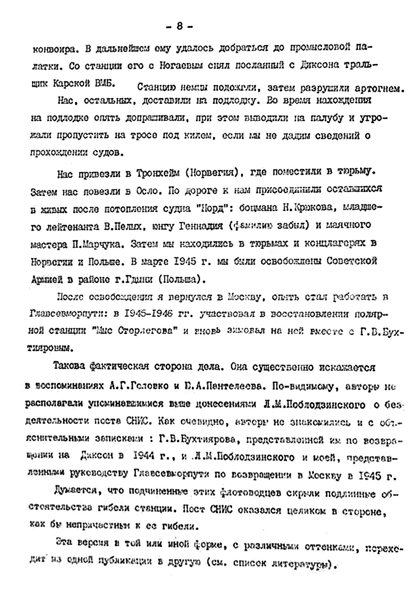 Такова фактическая сторона дела. Она существенно искажается в воспоминаниях А.Г. Головко и Ю.А. Пантелеева. По-видимому, авторы не располагали упоминавшимися выше донесениями Л.М. Поблодзинского о бездеятельности поста СНИС. Как очевидно, авторы не знакомились и с oбъяснительними записками: Г.В. Бухтиярова, представленной им по возвращении на Диксон в 1944 г., и Л.М. Поблодзинского и моей, представленными руксводству Главсевморпути по возвращении в Москву в 1945 г. Думается, что подчиненные этих флотоводцев скрыли подлинные обстоятельства гибели станции. Пост СНИС оказался целиком в стороне, как бы непричастным к ее гибели.