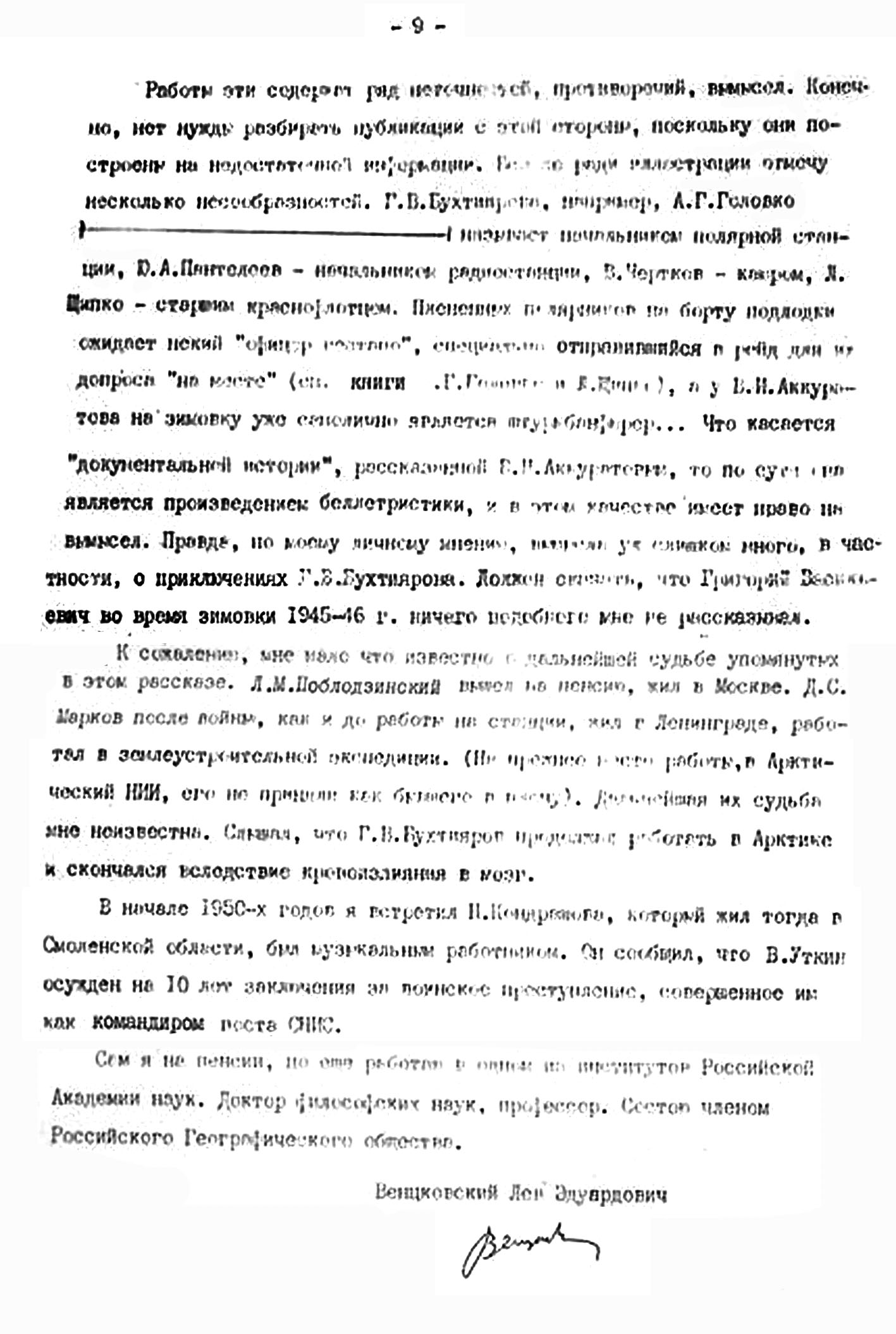 (вымарана часть строки) называет начальником полярной станции, Ю.А. Пантелеев-начальником радиостанции, В. Чертков-каюром, Л. Щипко-старшим краснофлотцем. Пленных полярников на борту подлодки ожидает некий «офицер гестапо», специально отправившийся в рейд для их допроса «на месте» (см. книги А.Г. Головко и Л. Щипко), а у В.И. Аккуратова на зимовку уже самолично является штурмбанфюрер… Что касается «документальной истории», рассказанной В.И. Аккуратовым, то по сути оно является произведением беллетристики, и в этом качестве имеет право на вымысел. Правда, по моему личному мнению, (слово неразборчиво) уж много, в частности, о приключениях Г.В. Бухтиярова. Должен сказать, Григорий Васильевич во время зимовки 1945-46 г. ничего подобного мне не рассказывал.