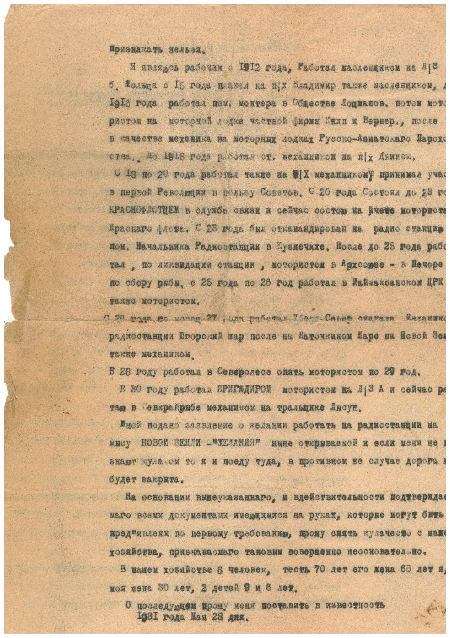Мной подано заявление о желании работать на радиостанции на мысу НОВОЙ ЗЕМЛИ - "ЖЕЛАНИЯ" ныне открываемой и если меня не признают кулаком то я и поеду туда, в противном же случае дорога мне будет закрыта.
