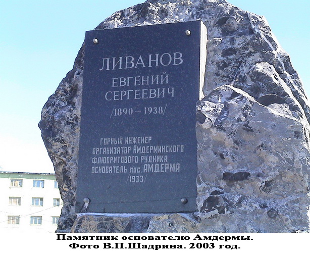 В 2003 году Амдерма отметила свое 70-летие. К юбилею в центре поселка был установлен памятник Евгению Сергеевичу Ливанову - основателю Амдермы. Горный инженер, Ливанов с 1916 года находился на военной службе, а с началом Гражданской войны служил в белой армии, воевал на Южном фронте в армии Дутова. Вместе с белыми эмигрировал в Монголию. Но в октябре 1921 года по призыву Особого пограничного отдела вернулся в Россию. В 1931 году был обвинен в «контрреволюционной деятельности» и приговорен к 10 лет концлагерей. Отбывал срок на Вайгаче. С 1933 года был назначен Начальником «командировки в Амдерму». Освобожден в 1936 году досрочно и отбыл в Новосибирск. 17 декабря 1937 года был вторично арестован, вновь обвинен в «крд» и приговорен к ВМН. Расстрелян в Новосибирске 8 января 1938 года.