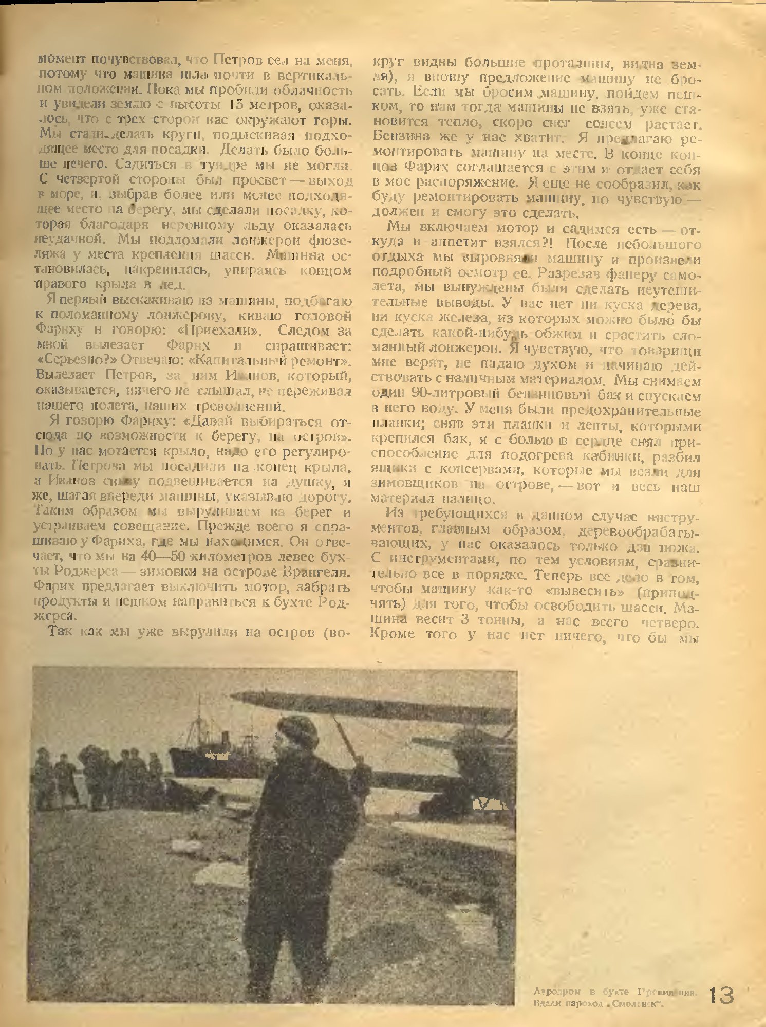 Я говорю Фариху: «Давай выбираться отсюда по возможности к берегу, на остров». Но у нас мотается крыло, надо его регулировать. Петрова мы посадили на конец крыла, а Иванов снизу подвешивается на душку, я же, шагая впереди машины, указываю дорогу. -Таким образом мы выруливаем на берег и устраиваем совещание. Прежде всего я спрашиваю у Фариха, где мы находимся. Он отвечает, что мы на 40—50 километров левее бухты Роджерса — зимовки на острове Врангеля. Фарих предлагает выключить мотор, забрать продукты и пешком направиться к бухте Роджерса.