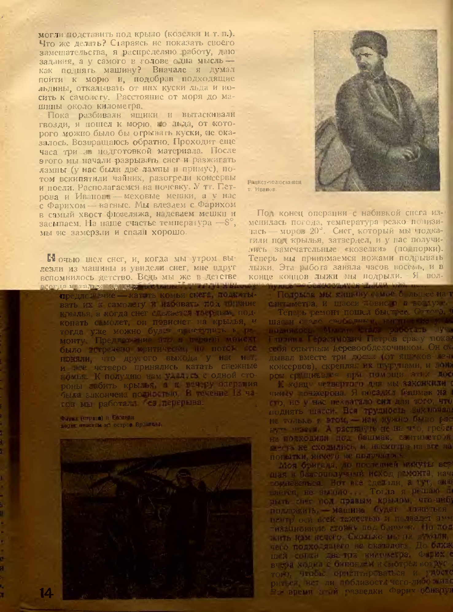 Пока разбивали ящики и вытаскивали гвозди, я пошел к морю, но льда, от которого можно было бы отрывать куски, не оказалось. Возвращаюсь обратно. Проходит еще часа три за подготовкой материала. После этого мы начали разрывать снег и разжигать лампы (у нас были две лампы и примус), потом вскипятили чайник, разогрели консервы и поели. Располагаемся на ночевку. У тт. Петрова и Иванова—меховые мешки, а у нас с Фарихом — ватные. Мы влезаем с Фарихом в самый хвост фюзеляжа, надеваем мешки и засыпаем. На наше счастье температура —8°, мы не замерзли и спали хорошо.