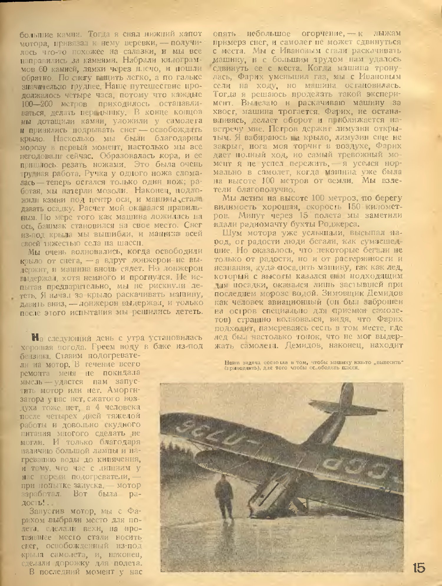 Моя бригада, до последней минуты верившая в благополучный исход ремонта, начала сомневаться. Вот все сделали, а тут, оказывается, не вышло... Тогда я решаю подрыть снег под правым крылом, что-нибудь подложить, — машина будет ложиться на центр оси всей тяжестью и подведет аммортизационную стойку под башмак. Но подложить нам нечего. Сколько мы ни думали, ничего подходящего не оказалось. До ближайшей сопки два-три километра. Фарих еще вчера ходил с биноклем и смотрел вокруг для того, чтобы ориентироваться и удостовериться, нет ли поблизости чего-либо живого. Во время этой разведки Фарих обнаружил большие камни. Тогда я снял нижний капот мотора, привязал к нему веревки, — получилось что-то похожее на салазки, и мы все направились за камнями. Набрали килограммов 60 камней, лямки через плечо, и пошли обратно. По снегу тащить легко, а по гальке значительно труднее. Наше путешествие продолжалось четыре часа, потому что каждые 100—200 метров приходилось останавливаться, делать передышку. В конце концов мы дотащили камни, уложили у самолета и принялись подрывать снег — освобождать крыло. Насколько мы были благодарны морозу в первый момент, настолько мы все негодовали сейчас. Образовалась кора, и ее пришлось резать ножами. Это была очень трудная работа. Ручка у одного ножа сломалась — теперь остался только один нож; работая, мы натерли мозоли. Наконец, подложили камни под центр оси, и машина стала давать осадку. Расчет мой оказался правиль­ным. По мере того как машина ложилась на ось, башмак становился на свое место. Снег из-под крыла мы вышибли, и машина всей своей тяжестью села на шасси. Мы очень волновались, когда освободили крыло от снега, — а вдруг лонжерон не выдержит, и машина вновь сядет. Но лонжерон выдержал, хотя немного и прогнулся. Не испытав предварительно, мы не рискнули лететь. Я начал за крыло раскачивать машину, давить вниз, — лонжерон выдержал, и только после этого испытания мы решились лететь.