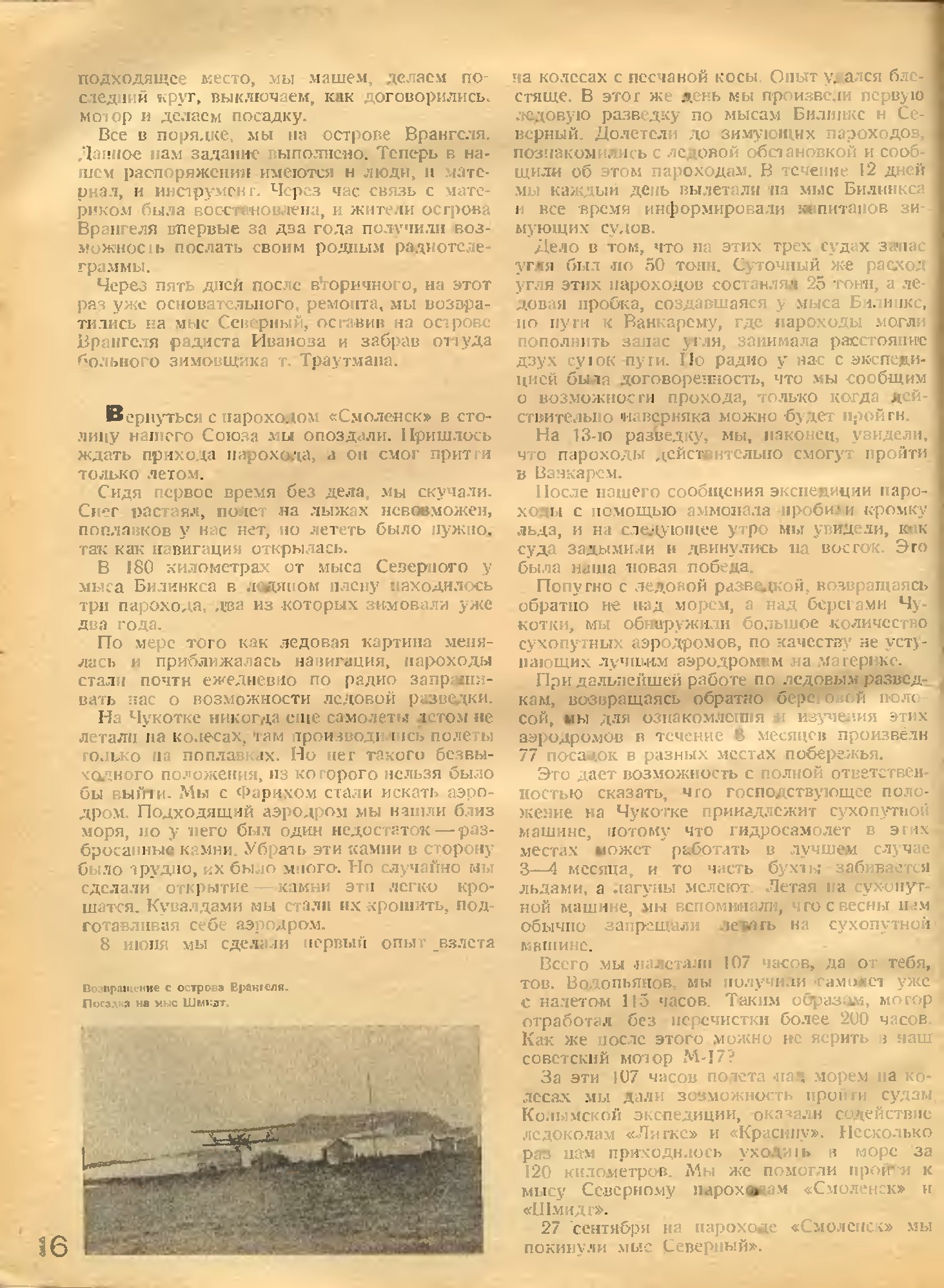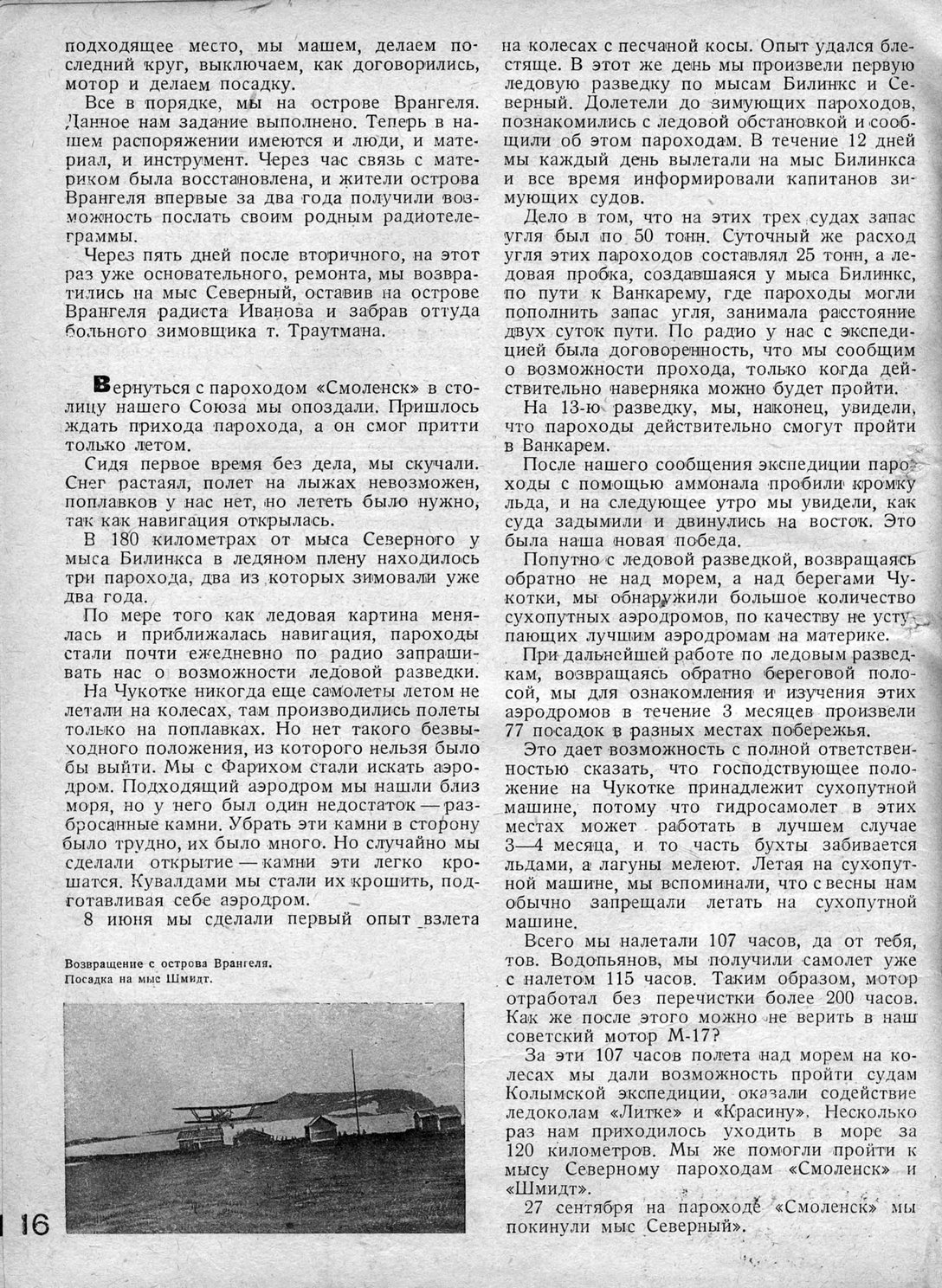 За эти 107 часов полета над морем на колесах мы дали возможность пройти судам Колымской экспедиции, оказали содействие ледоколам «Литке» и «Красину», Несколько раз нам приходилось уходить в море за 120 километров. Мы же помогли пройти к мысу Северному пароходам «Смоленск» и «Шмидт».