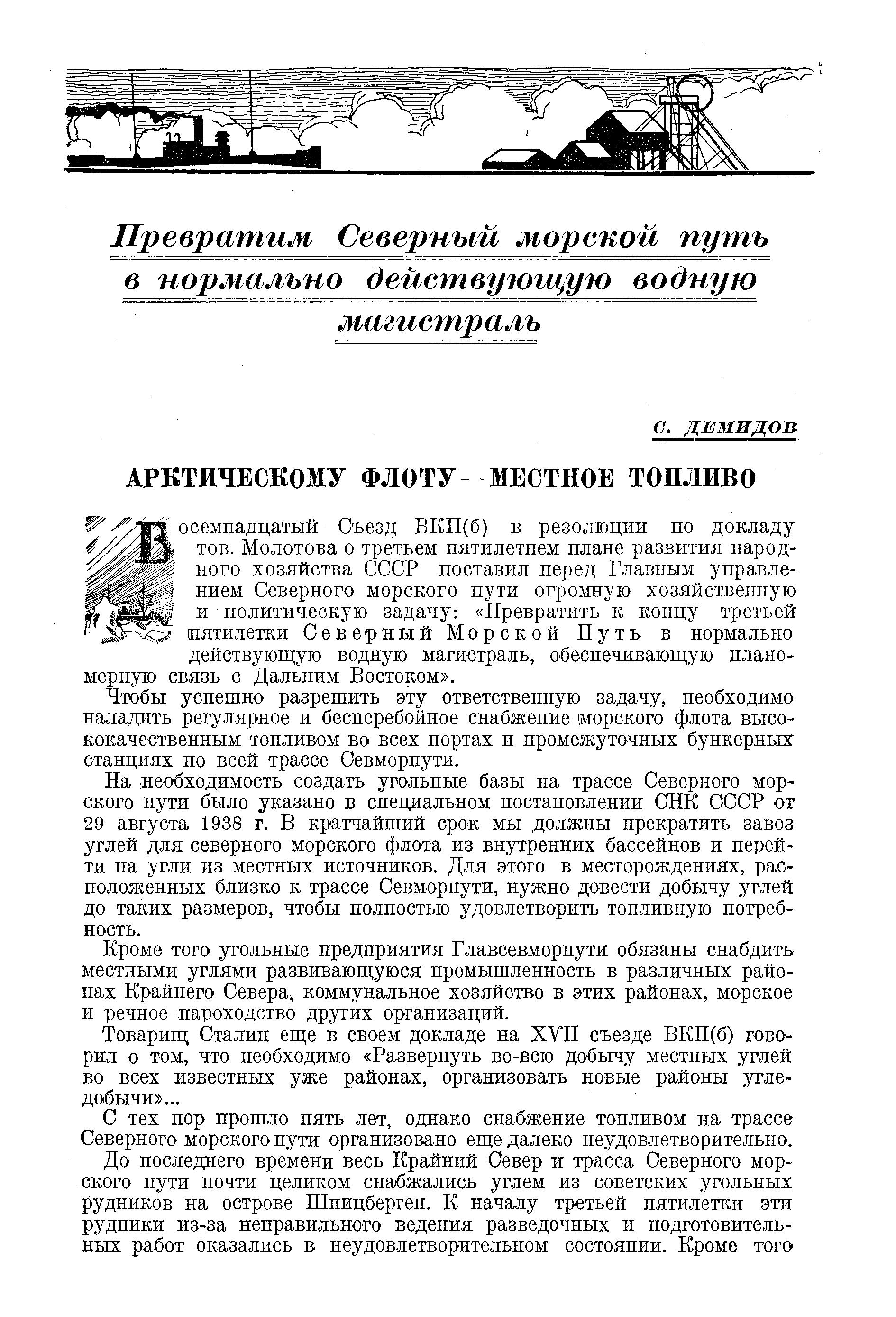 С. Демидов. Арктическому флоту - местное топливо. «Сов. Арктика», 1939, № 6