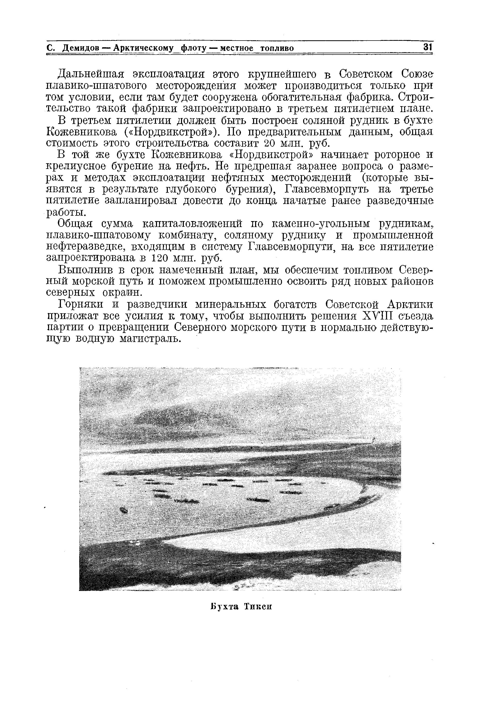Общая сумма капиталовложений по каменно-угольным рудникам, плавико-шпатовому комбинату, соляному руднику и промышленной нефтеразведке, входящим в систему Главсевморпути, на все пятилетие запроектирована в 120 млн. руб.