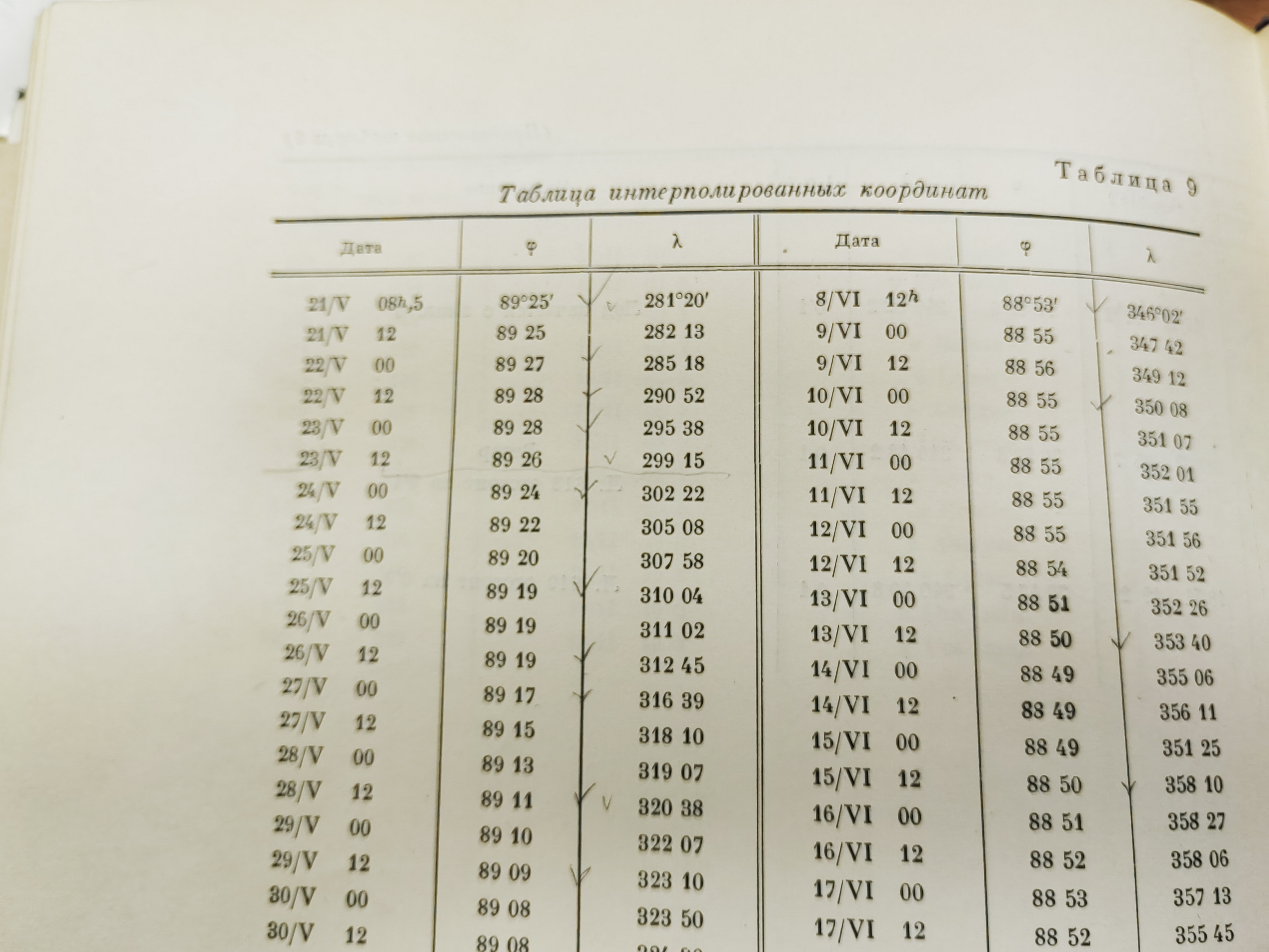 Александр Андреев пишет:Публиковались они многократно. Навскидку : "Труды дрейфующей станции "Северный полюс"" т.1 , изд. Главсевморпути, 1940 г. тир. 20000 экз. Книга продавалась в открытом доступе. Фрагмент карты дрейфа из вкладки и первый лист таблицы из статьи Е. К. Федорова "Астрономические определения", с. 280. Значение долготы для приведения к общепринятому виду нужно вычесть из 360. 360-281˚20' = 78˚40'
