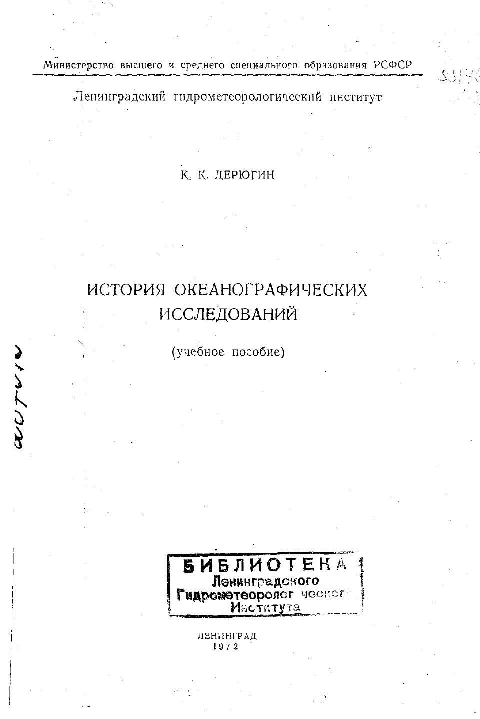 Дерюгин К. К. История океанографических исследований: учебное пособие. — Л.: ЛГМИ, Изд-во ЛПИ, 1972. — 96 с.