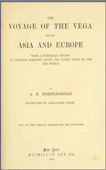 4. Путешествие вокруг Европы и Азии на пароходе “Вега” в 1878—1880 гг. Ч. 1. Спб, Валлениус, 1881. 4, 516, 2 стр. с илл, портр, черт.; 5 л. карт.; 3 л. портр.