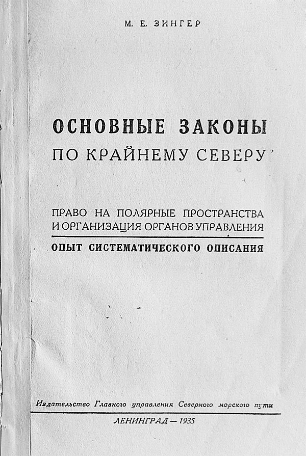 М.Е. Зингер. ОСНОВНЫЕ ЗАКОНЫ ПО КРАЙНЕМУ СЕВЕРУ. Право на полярные пространства и организация органов управления. /Опыт систематического описания.