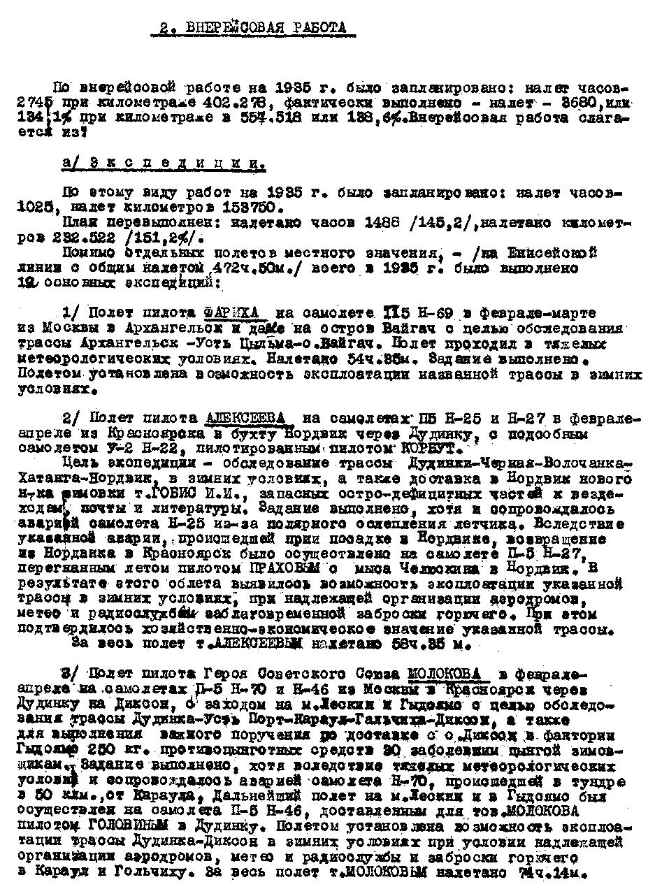 3/ Полет пилота Героя Советского Союза МОЛОКОВА в феврале-апреле на самолетах П-5 Н-70 и Н-46 из Москвы в Красноярск через Дудинку на Диксон, заходом на м. Лескин и Гыдоямо с целью обследования трассы Дудинка - Усть Порт - Караул - Гальчиха - Диксон, а также для выполнения важного поручения по доставке с о. Диксон в факторию Гыдоямо 250 кг, противоцинготных средств 30 заболевшим цингой зимовщикам. Задание выполнено, хотя вследствие тяжелых метеорологических условий и сопровождалось аварией самолета Н-70, происшедшей в тундре в 60 клм., от Караула. Дальнейший полет на м. Лескин и в Гыдоямо был осуществлен на самолета П-5 Н-46, доставленным для тов. МОЛОКОВА пилотом ГОЛОВИНЫМ в Дудинку. Полетом установлена возможность эксплоатации трассы Дудинка - Диксон в зимних условиях при условии надлежащей организации аэродромов, метео и радиослужбы и заброски горючего в Караул и Гольчиху. За весь полет т. МОЛОКОВЫМ налетано 74 ч. 14 м.