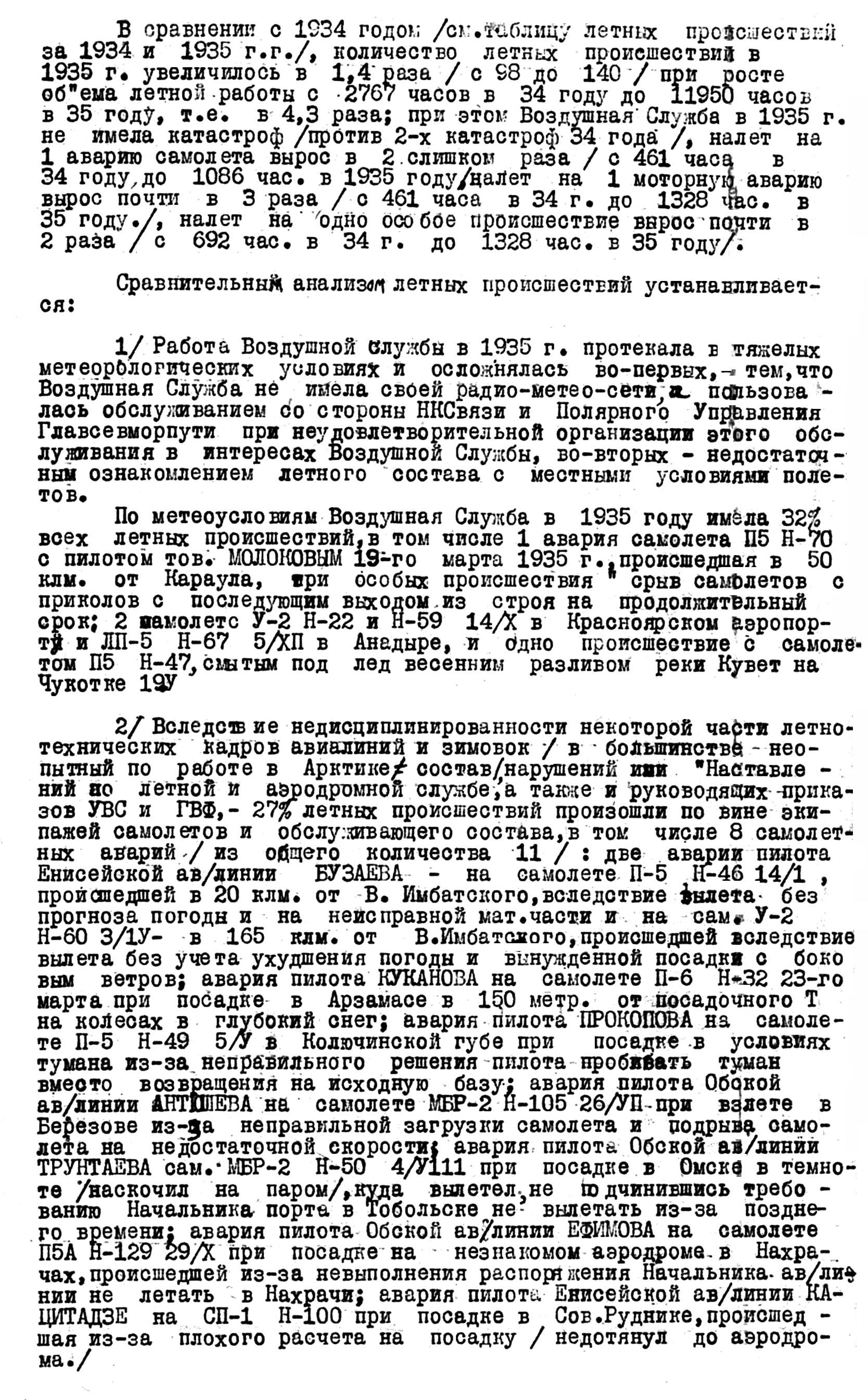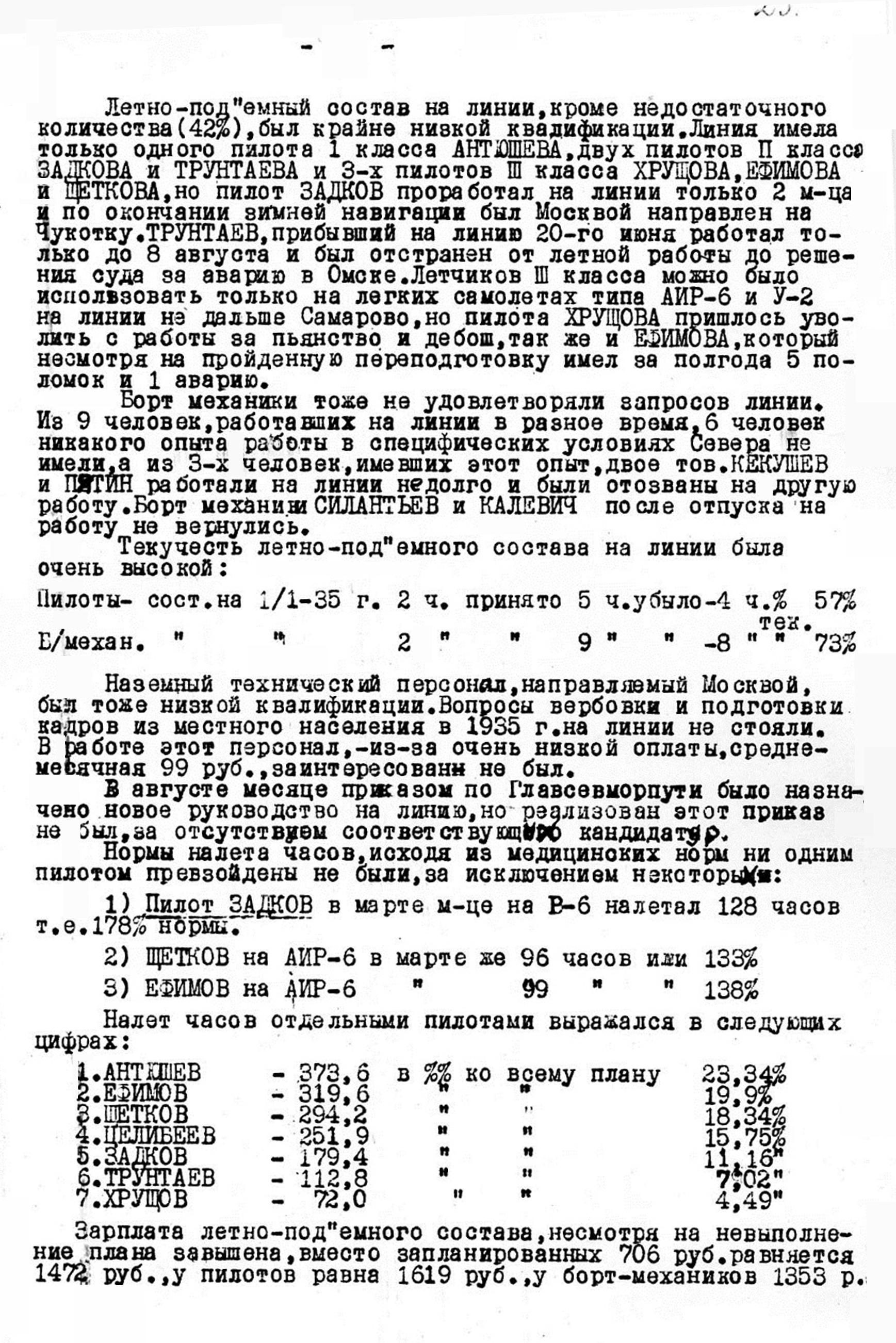 Главным образом на работу линии оказало влияние смена руководящего состава. Так за год было сменено 3 Начальника линий, 4 старших бухгалтера, 4 начальника Снабжения. Отсюда неудовлетворительное политико-моральное состояние на линии, пьянки и драки, смерть борт-механика краснознаменца КУКВЫ в августе 1935 г., пожар в Дудинской авиабазе, где в пьяном виде сгорел борт-механик экипажа пилота ГОЛОВИНА - НАЗАРОВ; прорыв в снабжении авиабаз горючим и запасными частями и ряд других происшествий.