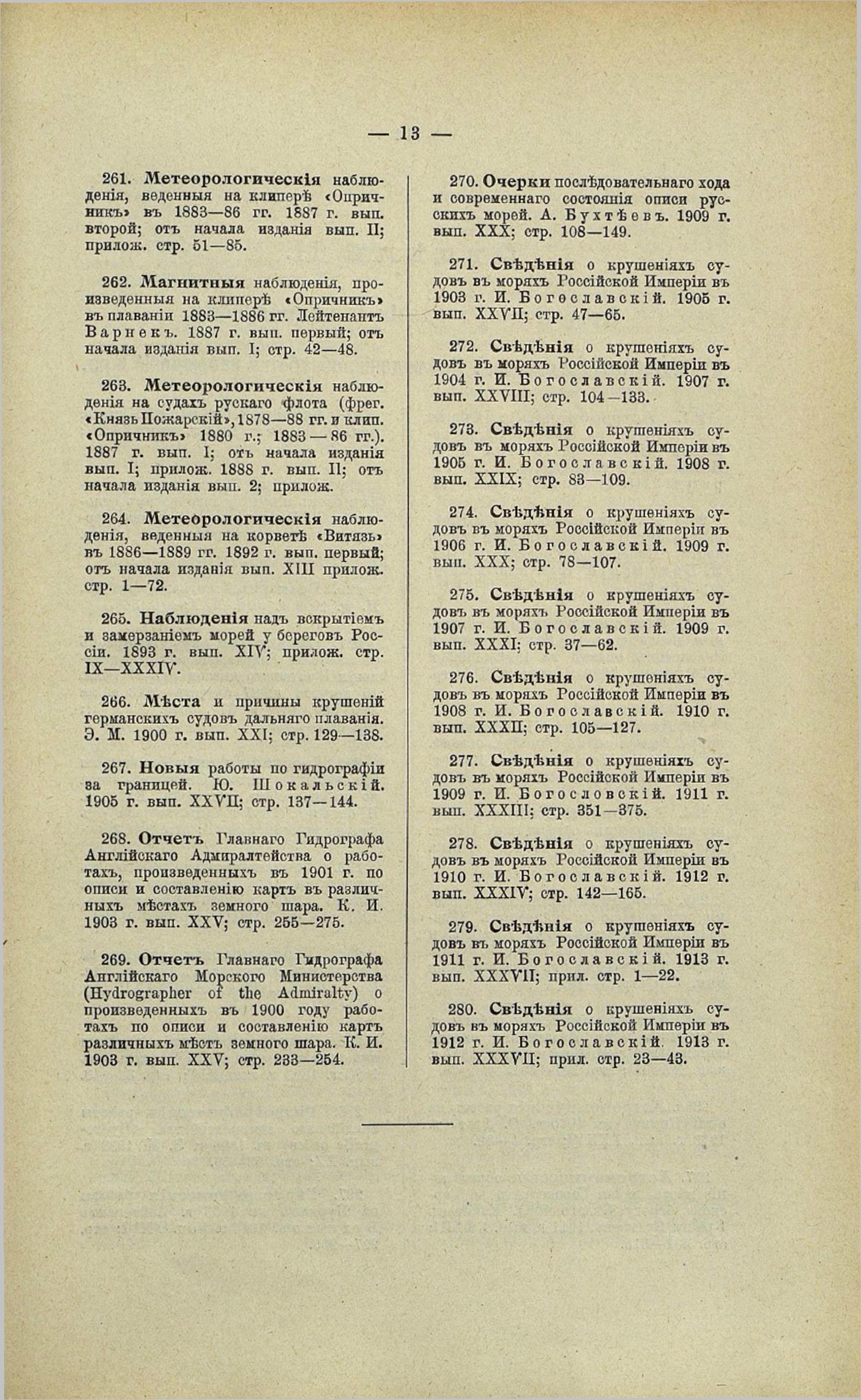 273. Сведения о крушениях судов в морях Российской Империи в 1905 г. И. Богославский. 1908 г. вып. XXIX; стр. 83—109.