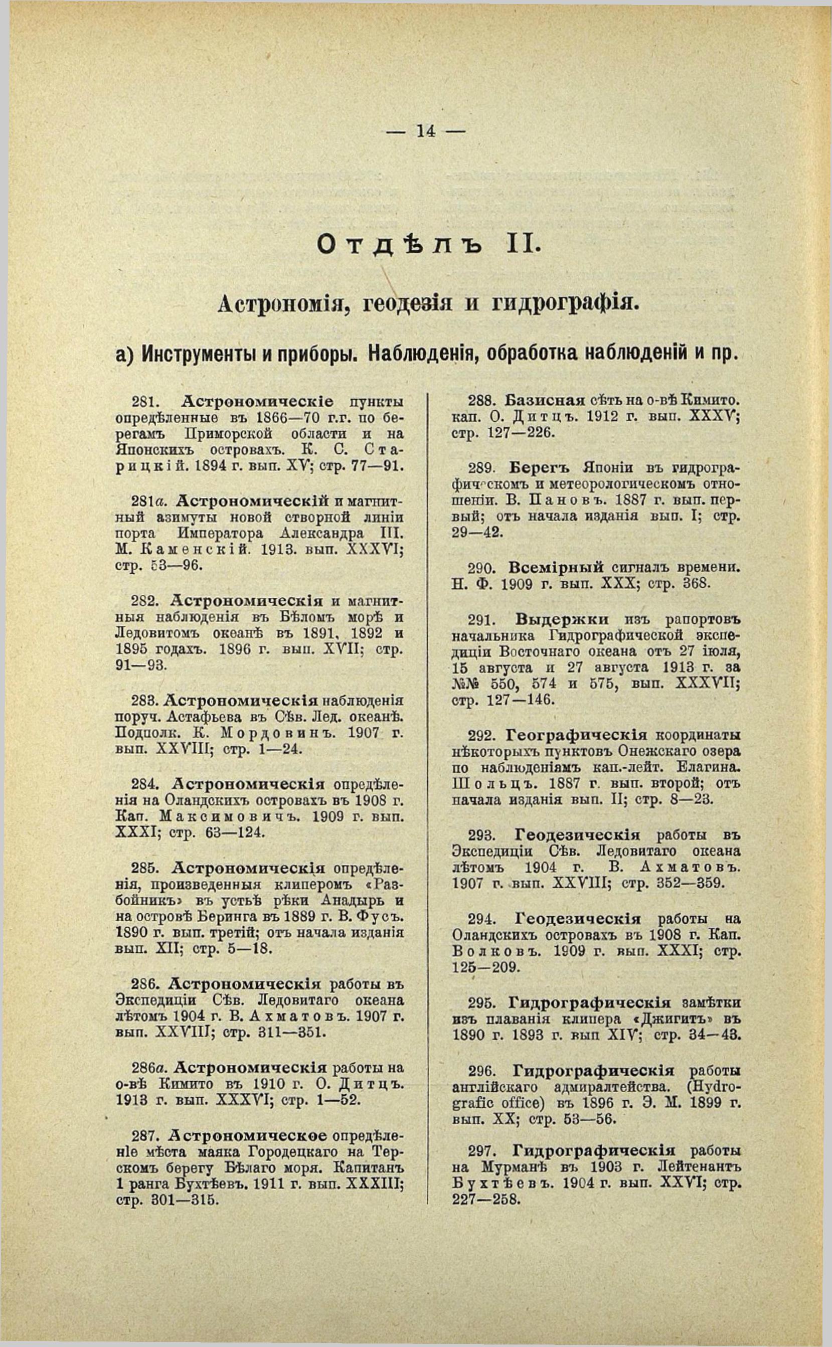 50. Астрономический и магнитный азимуты новой створной линии порта Императора Александра III. М. Каменский. 1913 г. вып. ХХХVІ; стр. 53—96.