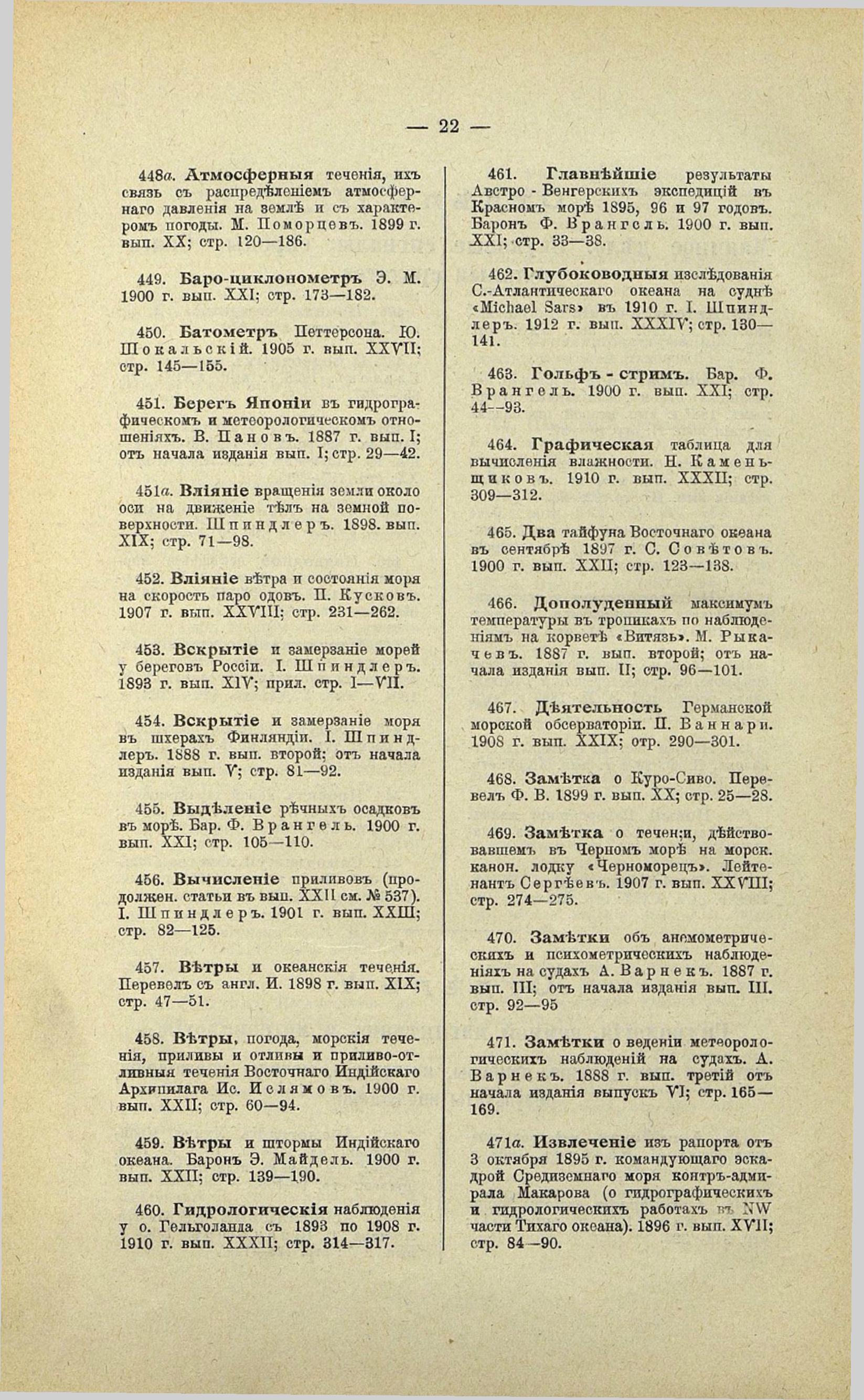 215. Система течений в Северном Европейском море. Мон. Перев. Ф. Врангель. 1888 г. вып. третий; от начала изд. вып. VI; стр. 21—67.