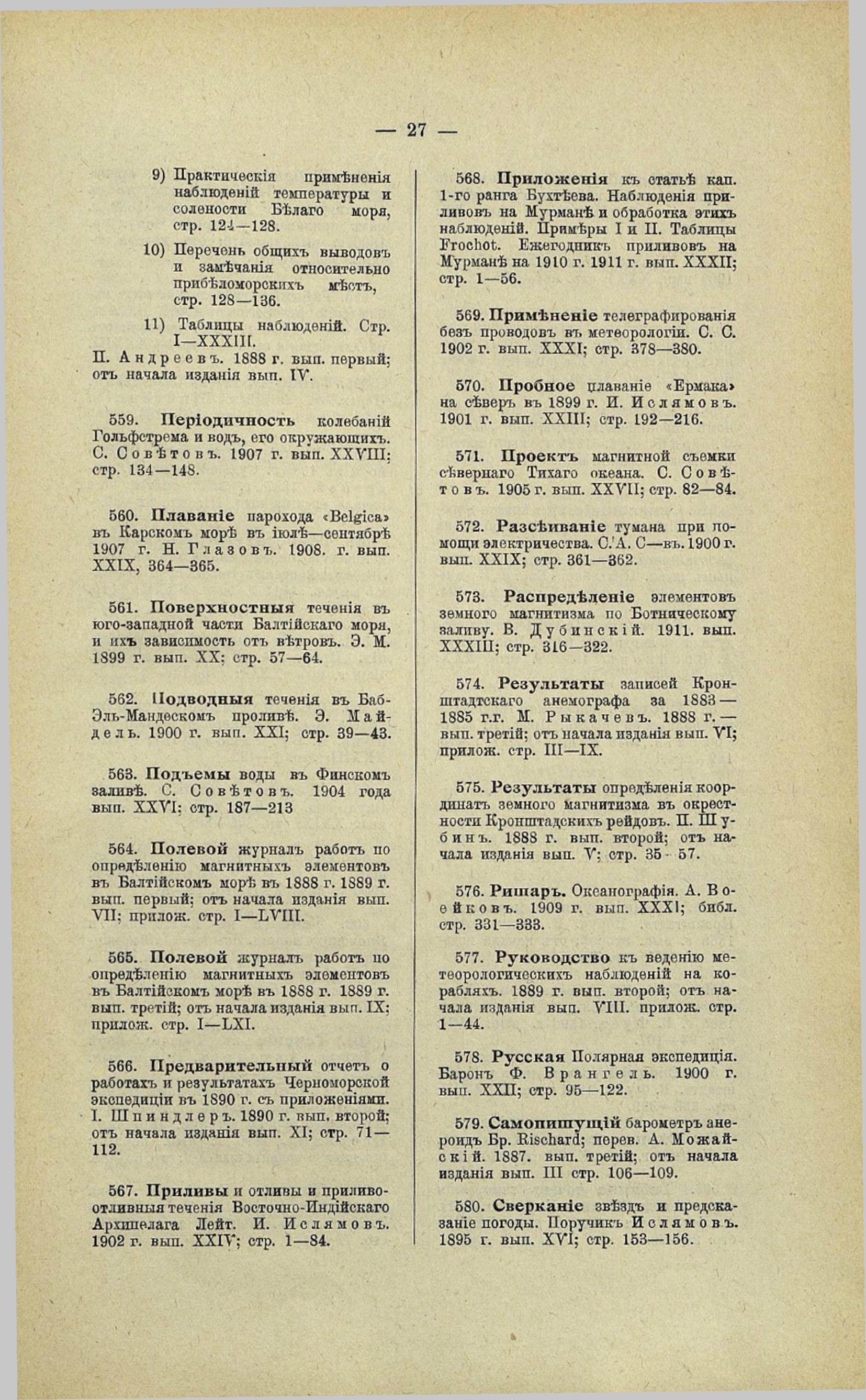 21. Краткий очерк гидрологических работ, произведенных в Белом море и Ледовитом океане в 1888 и 1889 годах. Н. Андреев. 1890 г. вып. третий; от начала издания вып. XII; стр. 54—66.