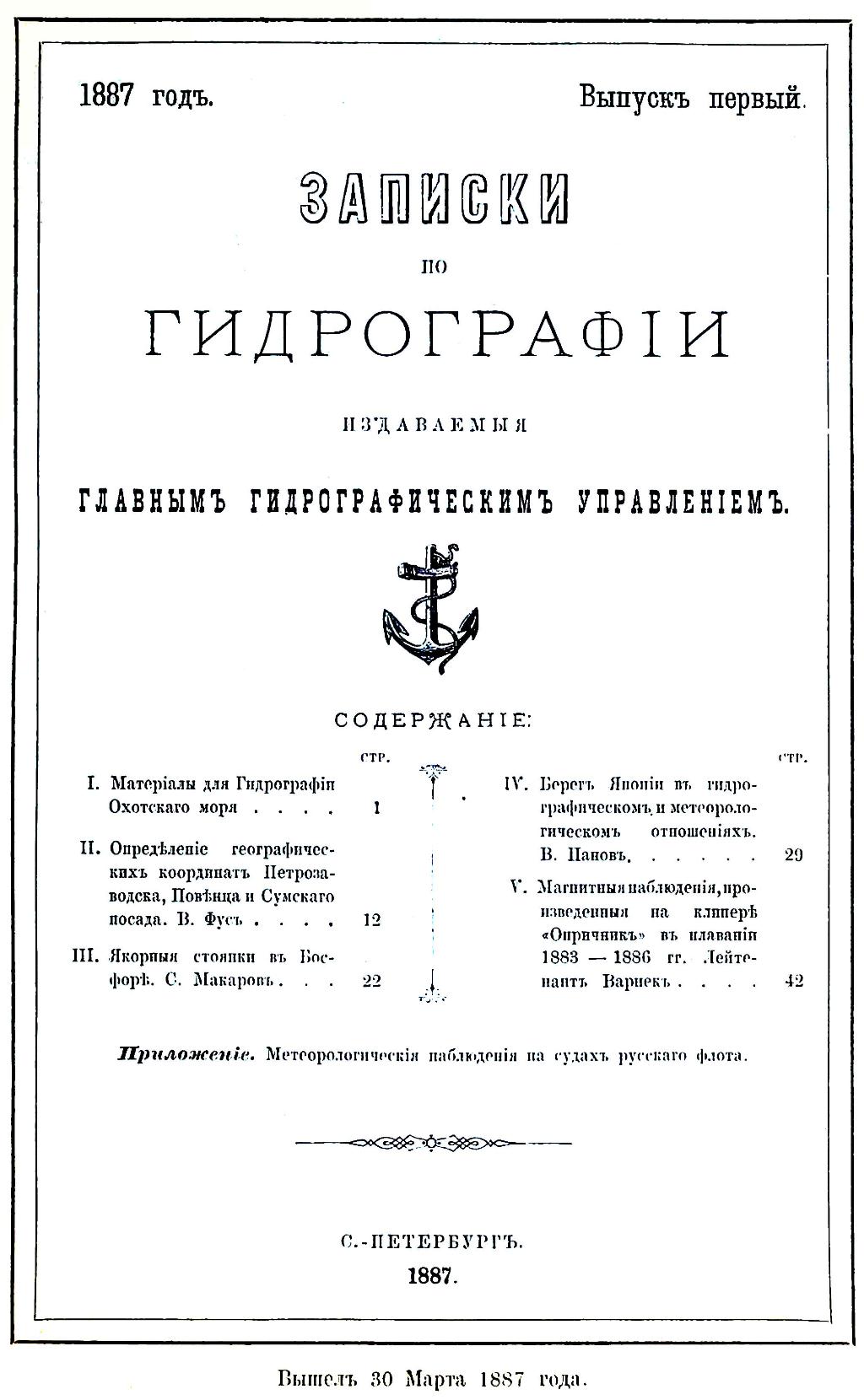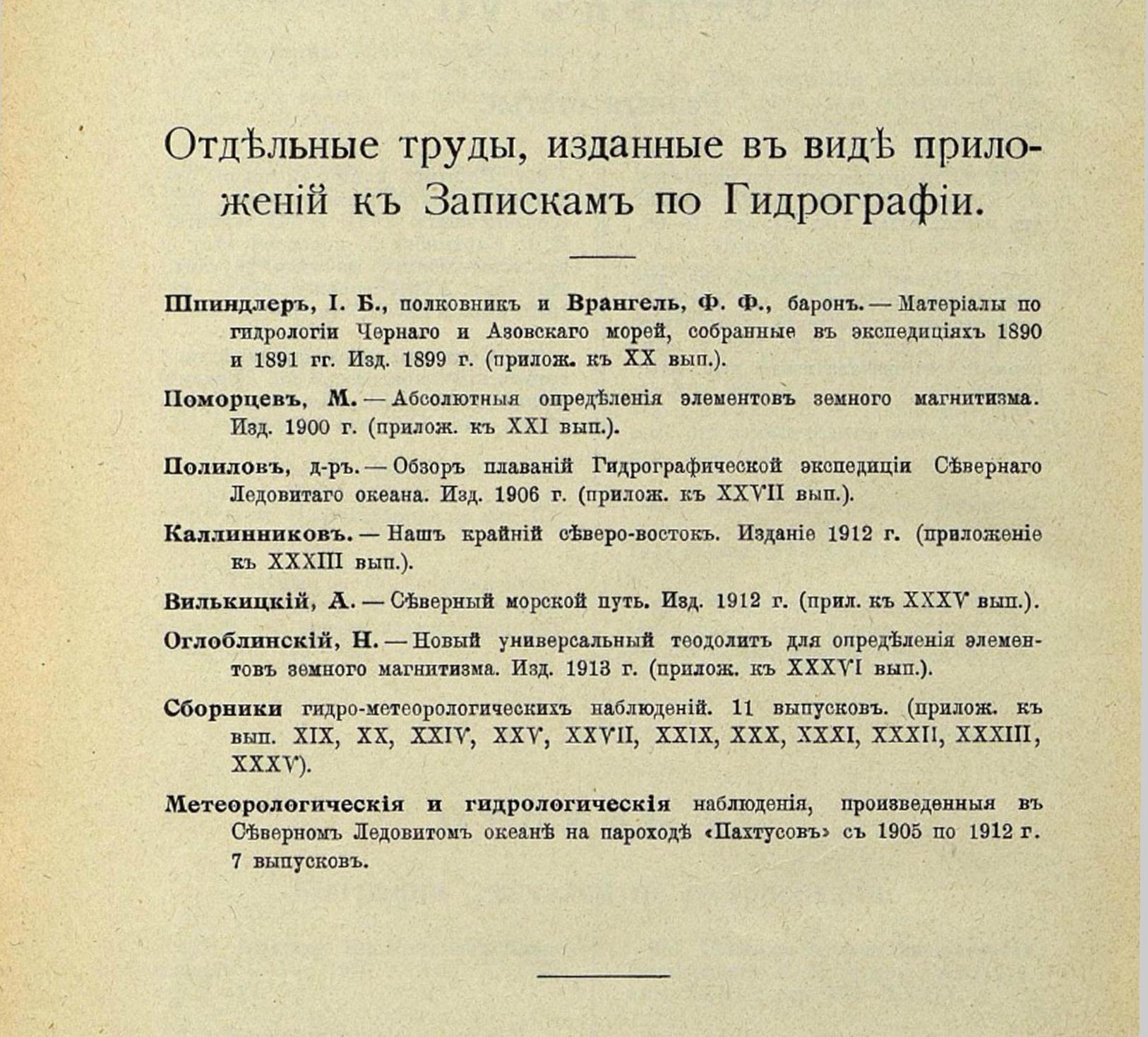 10. Гидрографические работы на Мурмане в 1903 году. Лейтенант Бухтеев. 1904 г. вып. XXVI; стр. 227—258.