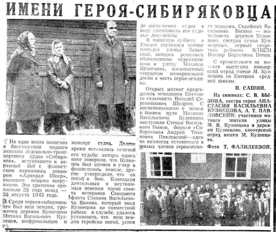 Из документов архива: «Старшина 1 статьи Кузнецов Михаил Васильевич, 1915 года рождения, член ВКП(б), русский, служащий, призванный Емецким РВК Архангельской области, проходивший службу на ледокольном транспорте «Сибиряков», погиб в бою 25 августа 1942 года. Место погребения – море».