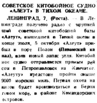 Вот как это было. Учился я на корабельного инженера, и весной 1957 г. надо было выбрать тему дипломного проекта, к которой обычно привязывалось и место преддипломной практики. Когда я увидел в предложенном списке «Китобойное судно для Дальнего Востока», то сразу испытал приятное волнение. Я знал, что в Беринговом море работала другая советская китобойная флотилия, «Алеут», и сам этот объект, и далекое путешествие туда обещали много интересного.