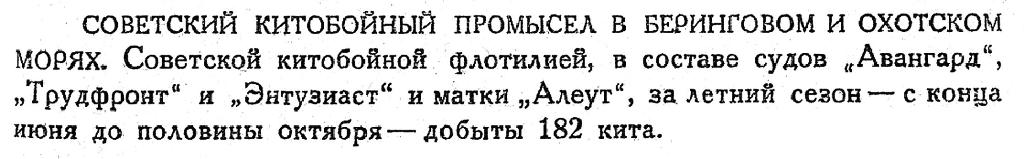 СОВЕТСКИЙ КИТОБОЙНЫЙ ПРОМЫСЕЛ В БЕРИНГОВОМ И ОХОТСКОМ МОРЯХ. Советской китобойной флотилией, в составе судов "Авангард", "Трудфронт" и "Энтузиаст" и матки "Алеут", за летний сезон — с конца июня до половины октября — добыты 182 кита.