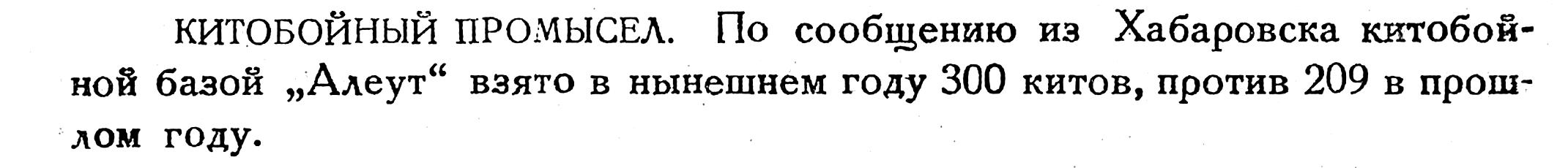 КИТОБОЙНЫЙ ПРОМЫСЕЛ. По сообщению из Хабаровска китобойной базой „Алеут“ взято в нынешнем году 300 китов, против 209 в прошлом году.