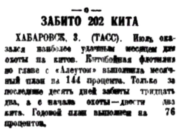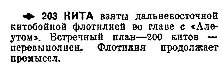 Но опять случилось непредвиденное: во время шторма был поврежден упорный подшипник гребного вала, а это значит: стоп машина, хода нет, судно разворачивается бортом к волне и превращается в неуправляемый поплавок. Буксир подошел спустя полдня, всё это время я сидел в каюте, поглядывая на иллюминатор, который то уходил глубоко под воду, то выныривал и смотрел высоко в небо. Буксир привел нас в Петропавловск-Камчатский, где за день был сделан необходимый ремонт, а мне представилась возможность сойти на берег и осмотреть одну из окрестных сопок. Как говорят, не было бы счастья, да несчастье помогло: благодаря этим двум авариям я познакомился с двумя великолепными бухтами – в Находке и Петропавловске. Остаток пути прошел без приключений. Флотилия в это время встала на рейде около острова Медный (меньший из Командорских островов) и устроила выходной день с выходом на берег, благо в посылках было, в основном, спиртное. Выпивали китобои хорошо, но без каких бы то ни было эксцессов. ....