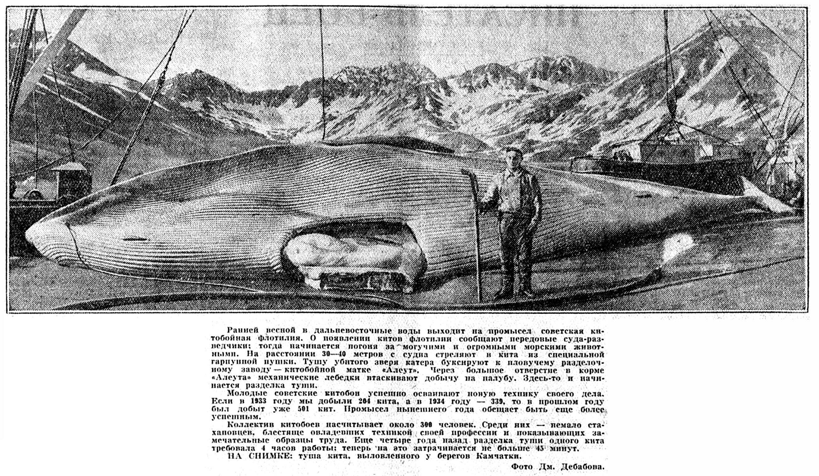 Молодые советские китобои успешно осваивают новую технику своего дела. Если в 1933 году мы добыли 204 кита, а в 1934 году — 339, то в прошлом году был добыт уже 501 кит. Промысел нынешнего года обещает быть еще более успешным.