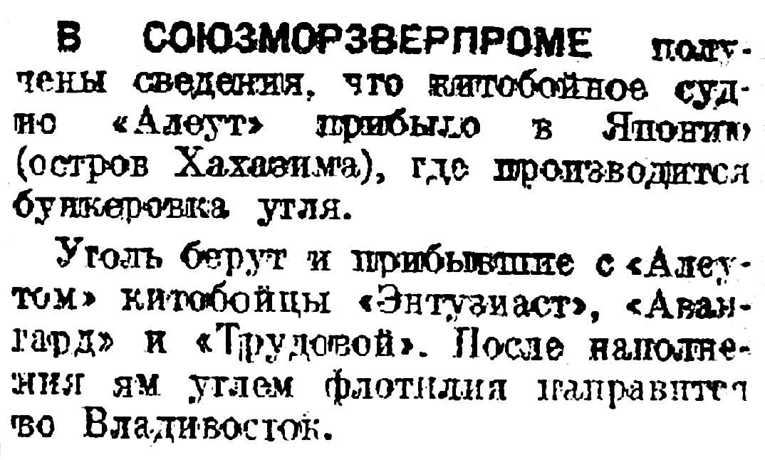На-днях китобойная флотилия во главе с пароходом-фабрикой «Алеут» вернется во Владивосток. Этим закончится первый рейс первой советской китобойной флотилии.