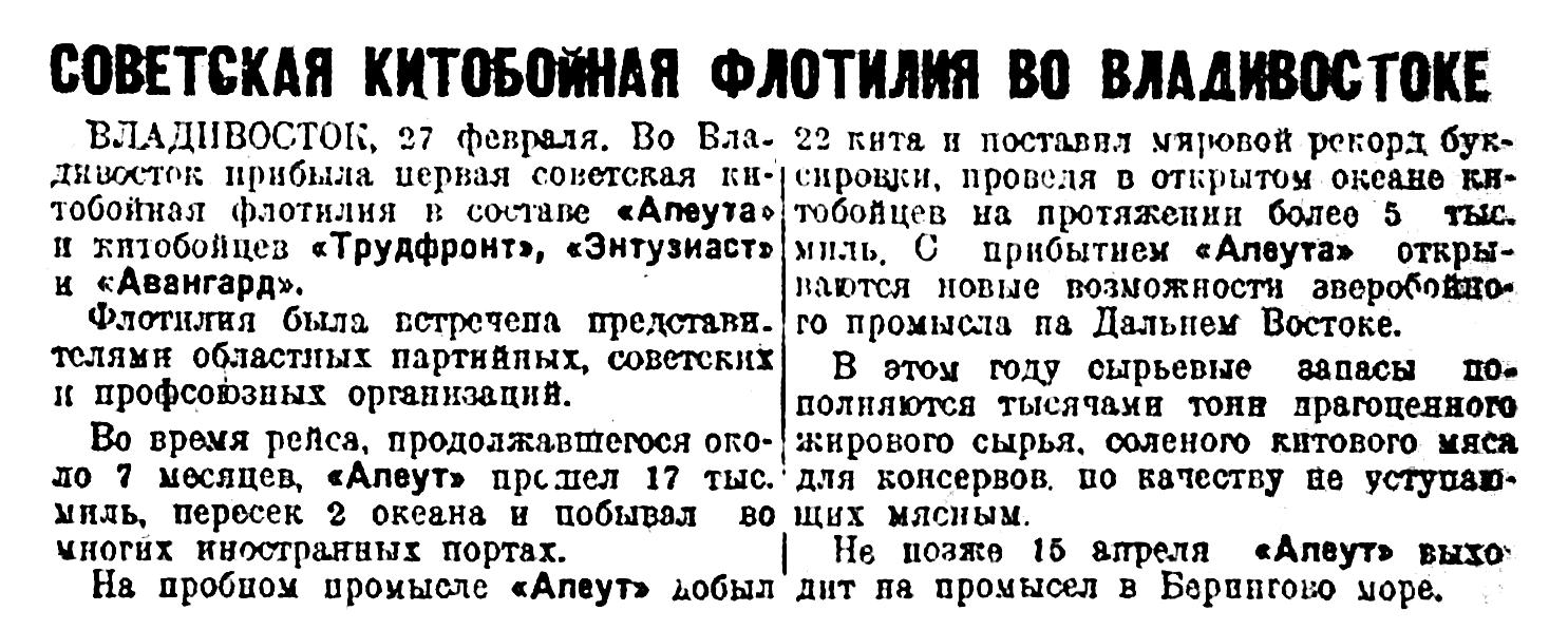 ВЛАДИВОСТОК, 27 февраля. Во Владивосток прибыла первая советская китобойная флотилия в составе «Алеута» и китобойцев «Трудфронт», «Энтузиаст» и «Авангард».