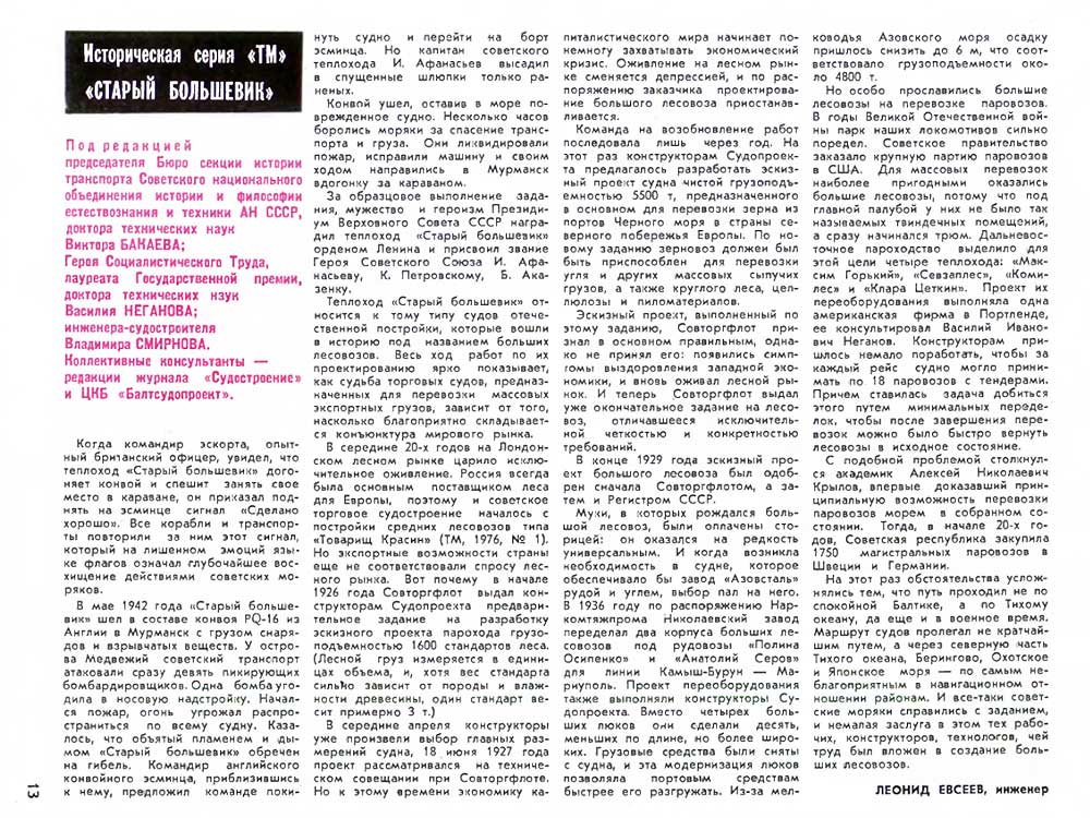 Теплоход "Старый большевик" относится к тому типу судов отечественной постройки, которые вошли в историю под названием больших лесовозов. Весь ход работ по их проектированию ярко показывает, как судьба торговых судов, предназначенных для перевозки массовых экспортных грузов, зависит от того, насколько благоприятно складывается конъюнктура мирового рынка.
