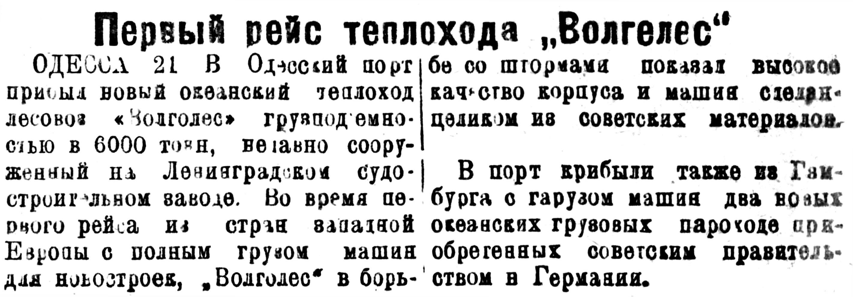В конце 1929 года эскизный проект большого лесовоза был одобрен сначала Совторгфлотом, а затем и Регистром СССР.