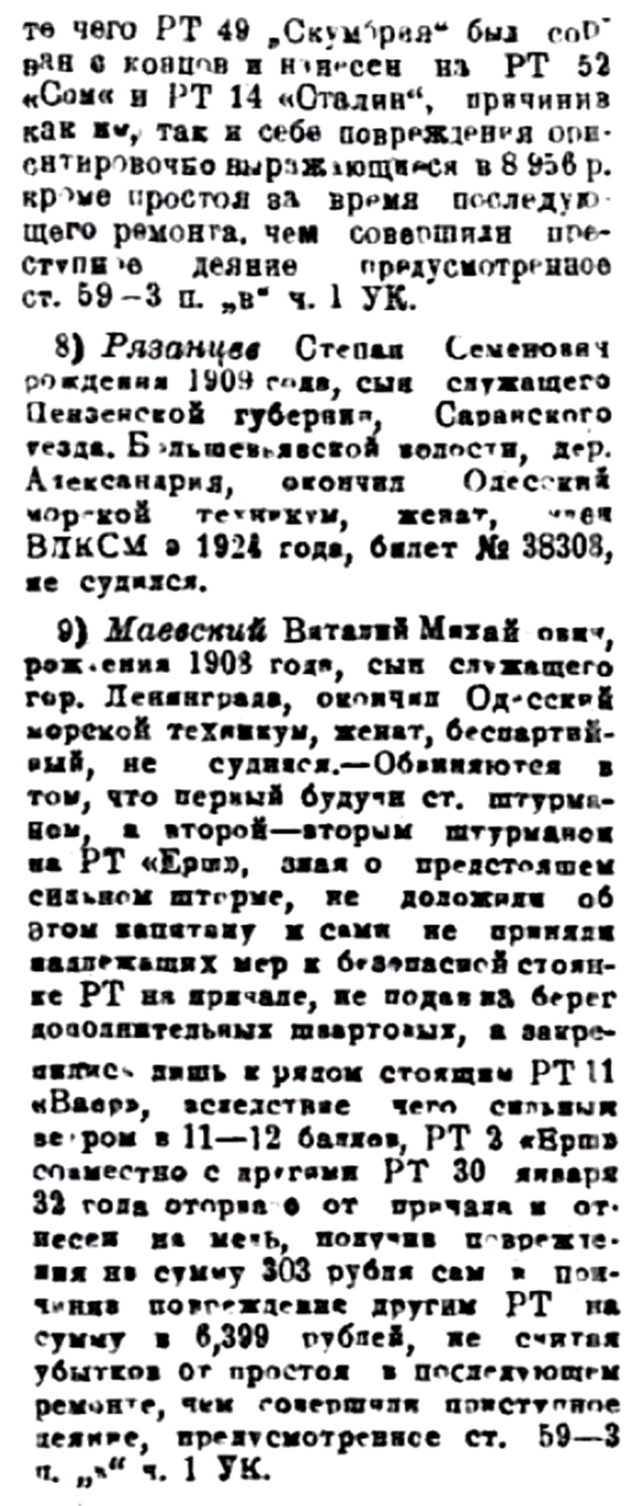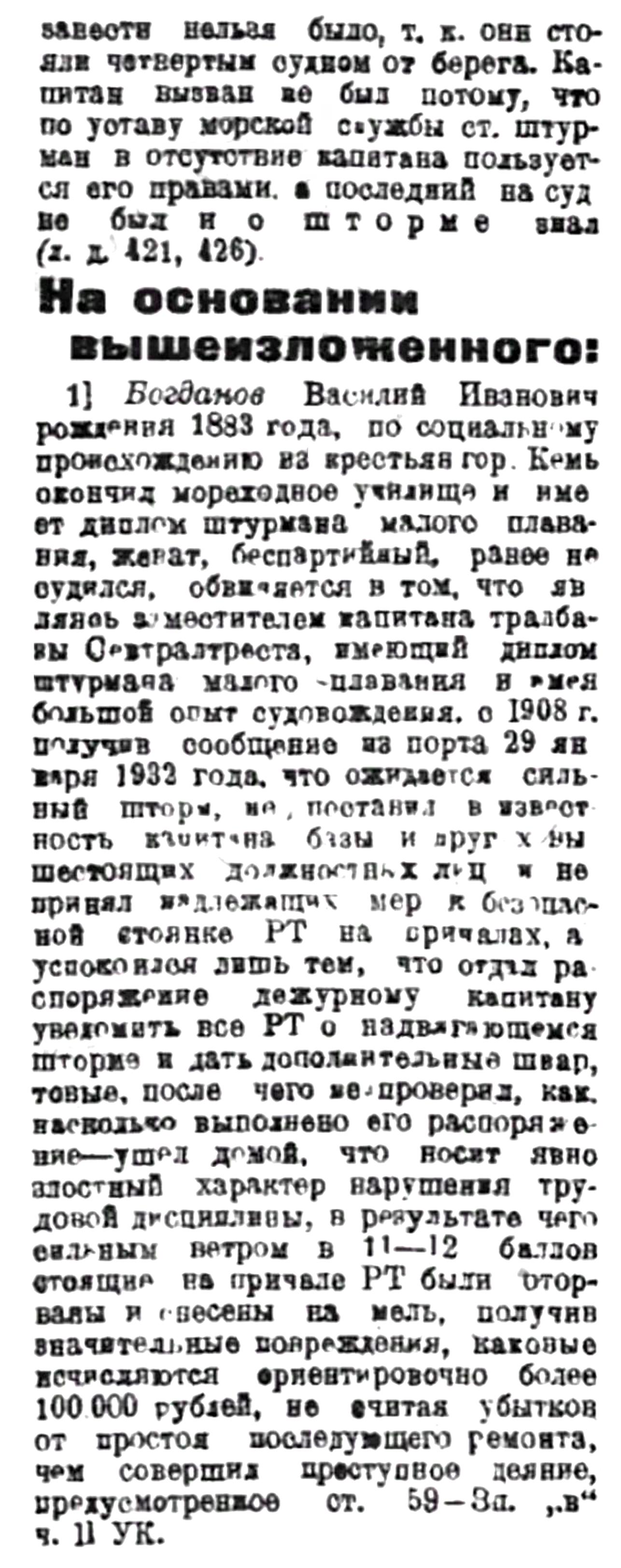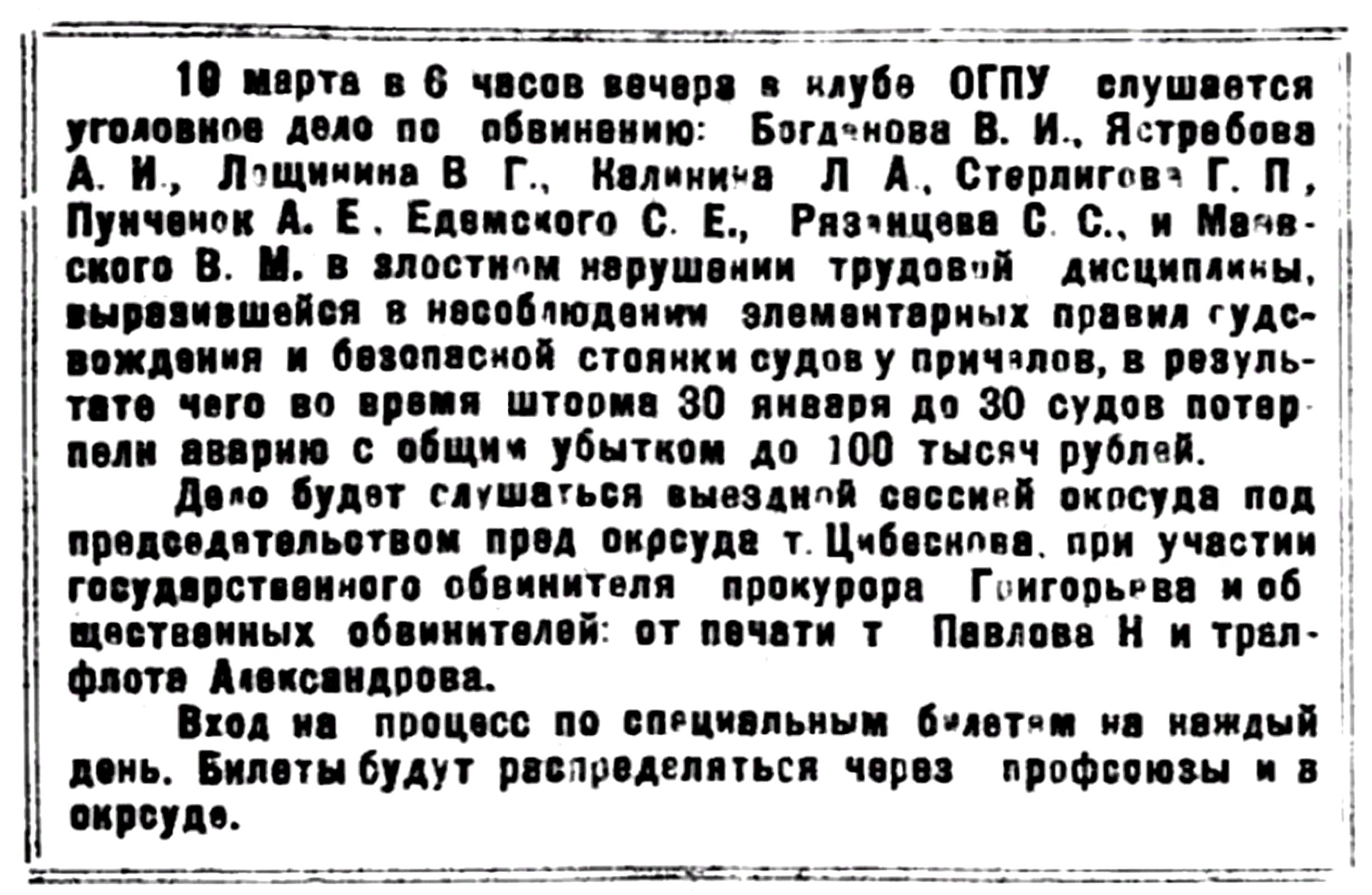 10 марта в 6 часов вечера в клубе ОГПУ слушается уголовное дело по обвинению: Богданова В. И., Ястребова А. И., Лощинина В. Г., Калинина Л. А, Стерлигова Г. П., Пунченок А. Е., Едемского С. Е., Рязанцева С С., и Маевского В. М. в злостном нарушении трудовой дисциплины, выразившейся в несоблюдении элементарных правил судовождения и безопасной стоянки судов у причалов, в результате чего во время шторма 30 января до 30 судов потерпели аварию с общим убытком до 100 тысяч рублей.