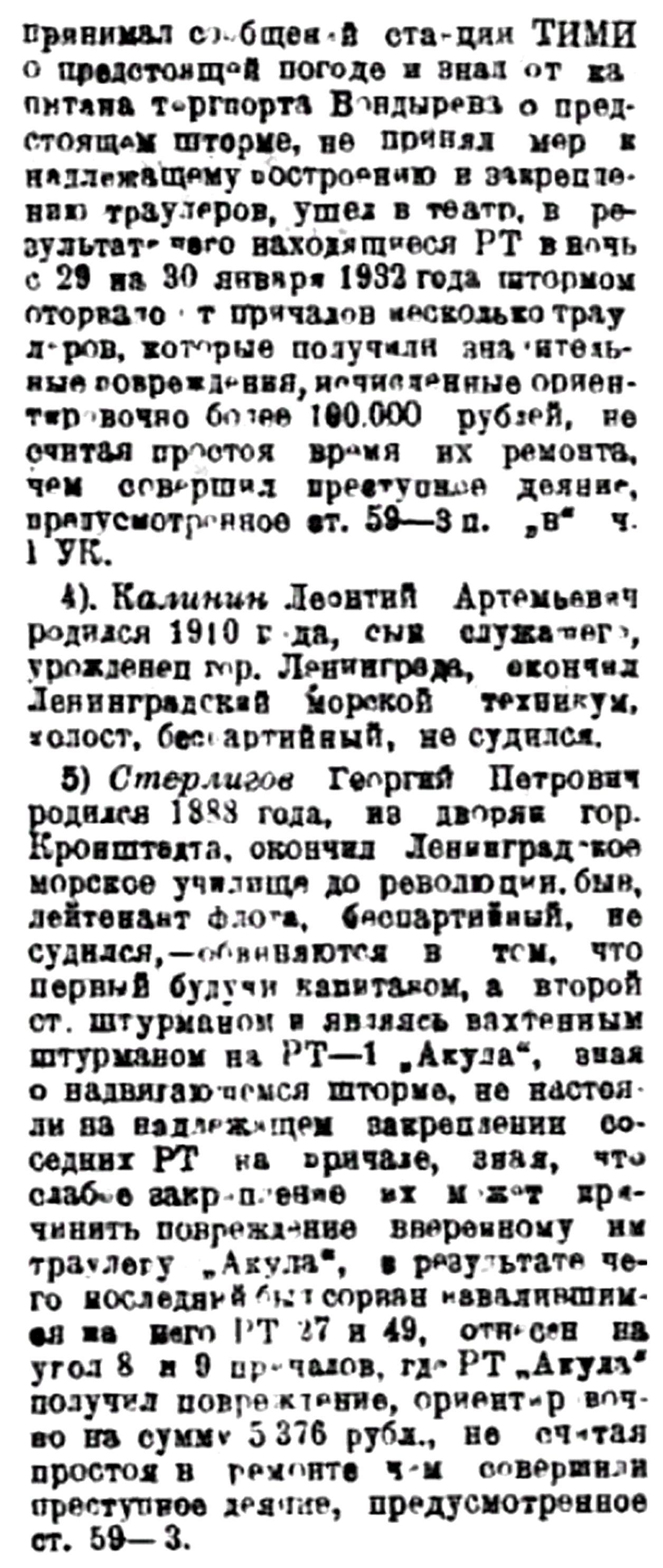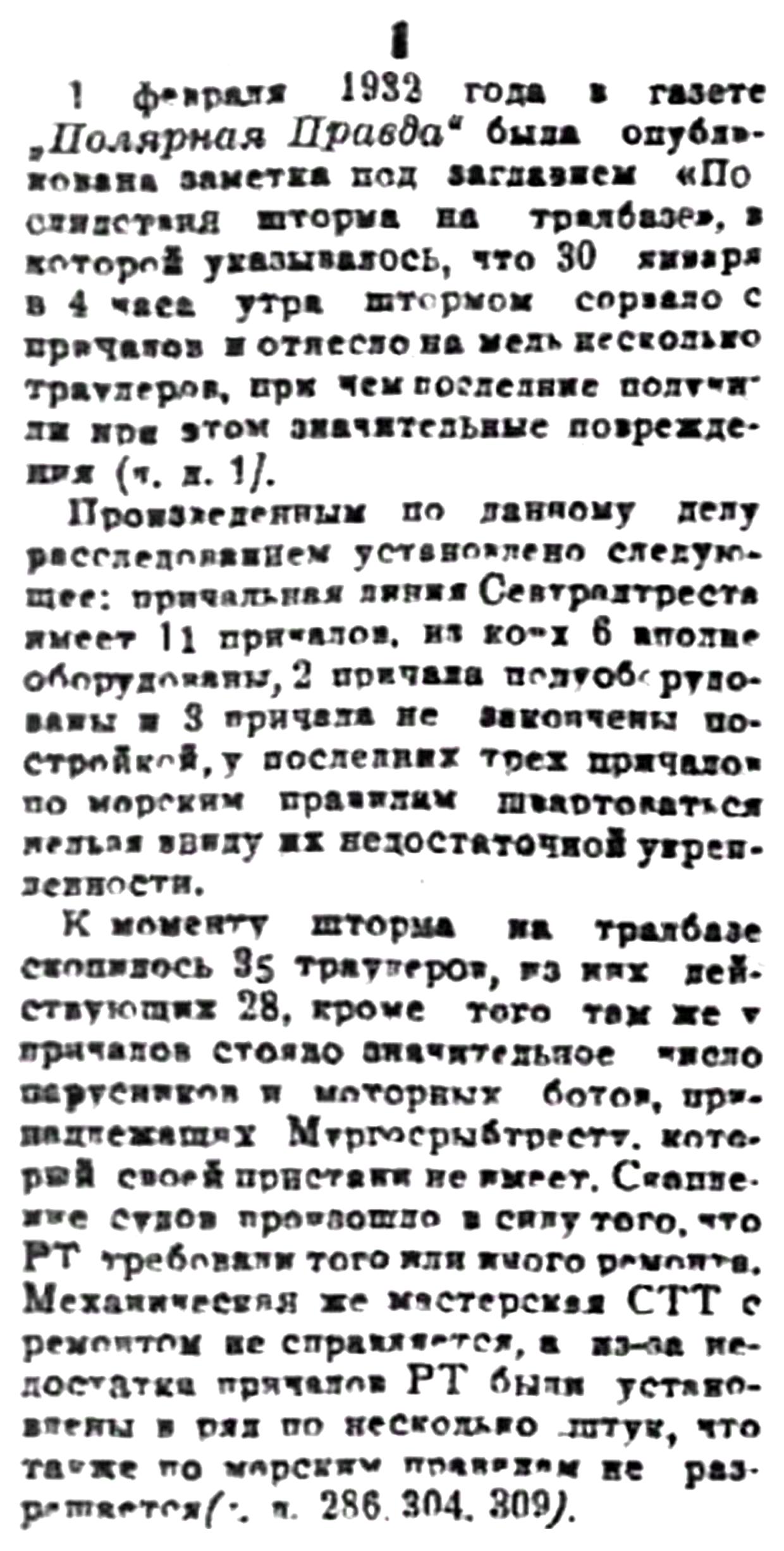 1 февраля 1932 года в газете "Полярная Правда" была опубликована заметка под заглавием "Последствия шторма на тралбазе", в которой указывалось, что 30 января в 4 часа утра штормом сорвало с причалов и отнесло на мель несколько траулеров, при чем последние получили при этом значительные повреждения (л. д. 1).
