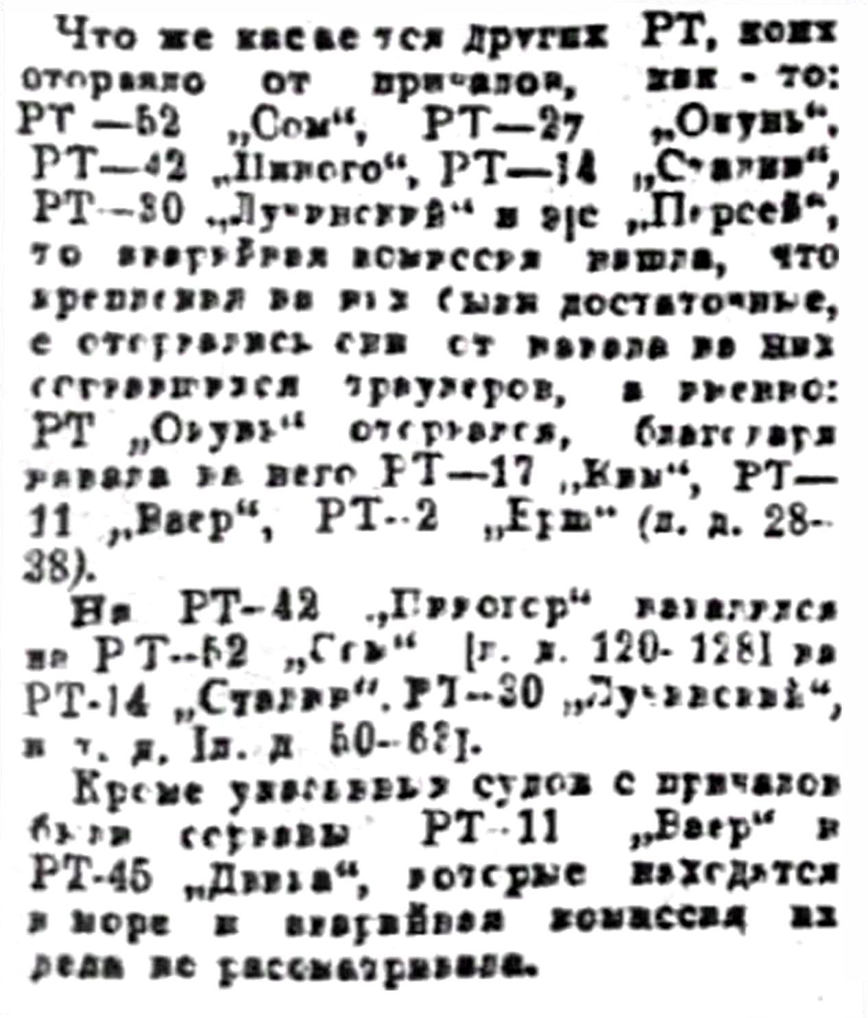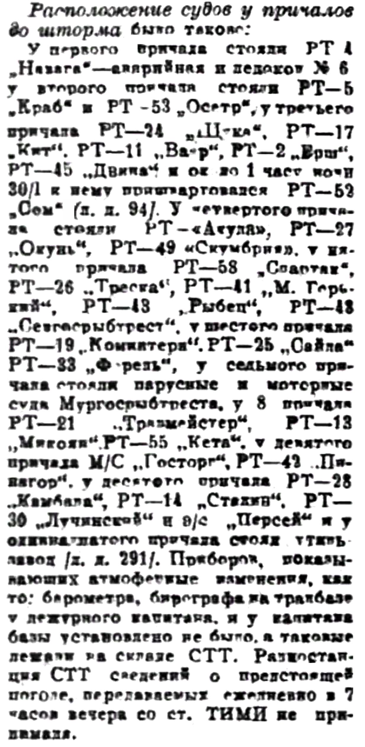 ни одному судну, стоящему у причалов и на рейде, ни нашим ни иностранным. Капитан порта своевременно известил траловую базу об ожидаемом шторме, однако, там к этому отнеслись по бюрократически, ограничившись лишь посылкою матросов по траулерам, те траулеры, которые приняли кое-какие меры, как например траулеры №№ 6, 5, 24, 58, 26, 41, 43, 48, 19, 25 и другие не были сорваны штормом, но другие за №№ 17, 11, 2, 45, 52, 1, 27, 49 преступно забыли о своих обязанностях и погубили не только свои суда но и другие, на которые их нанесло ветром.