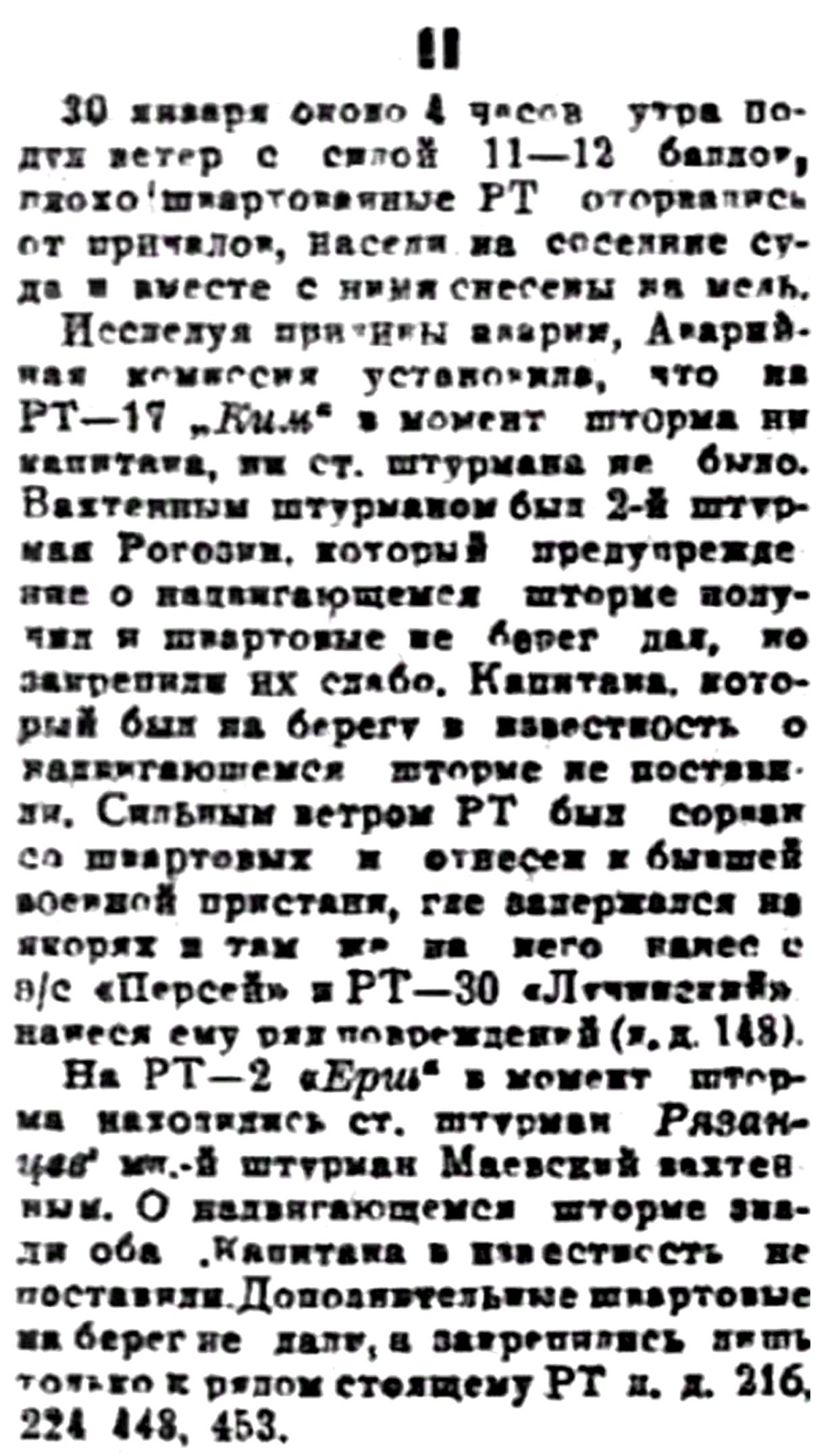 30 января около 4 утра подул ветер с силой 11—12 баллов, плохо швартованные РТ оторвались от причалов, насели на соседние суда и вместе с ними снесены на мель.