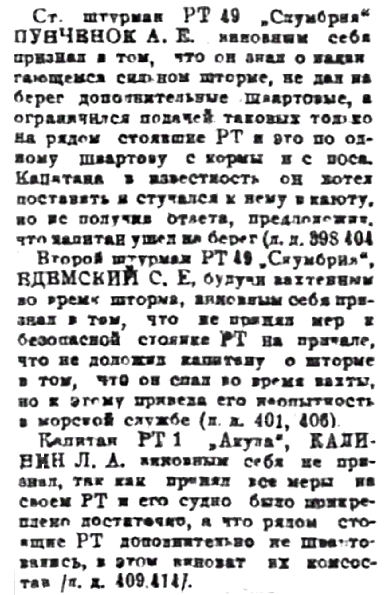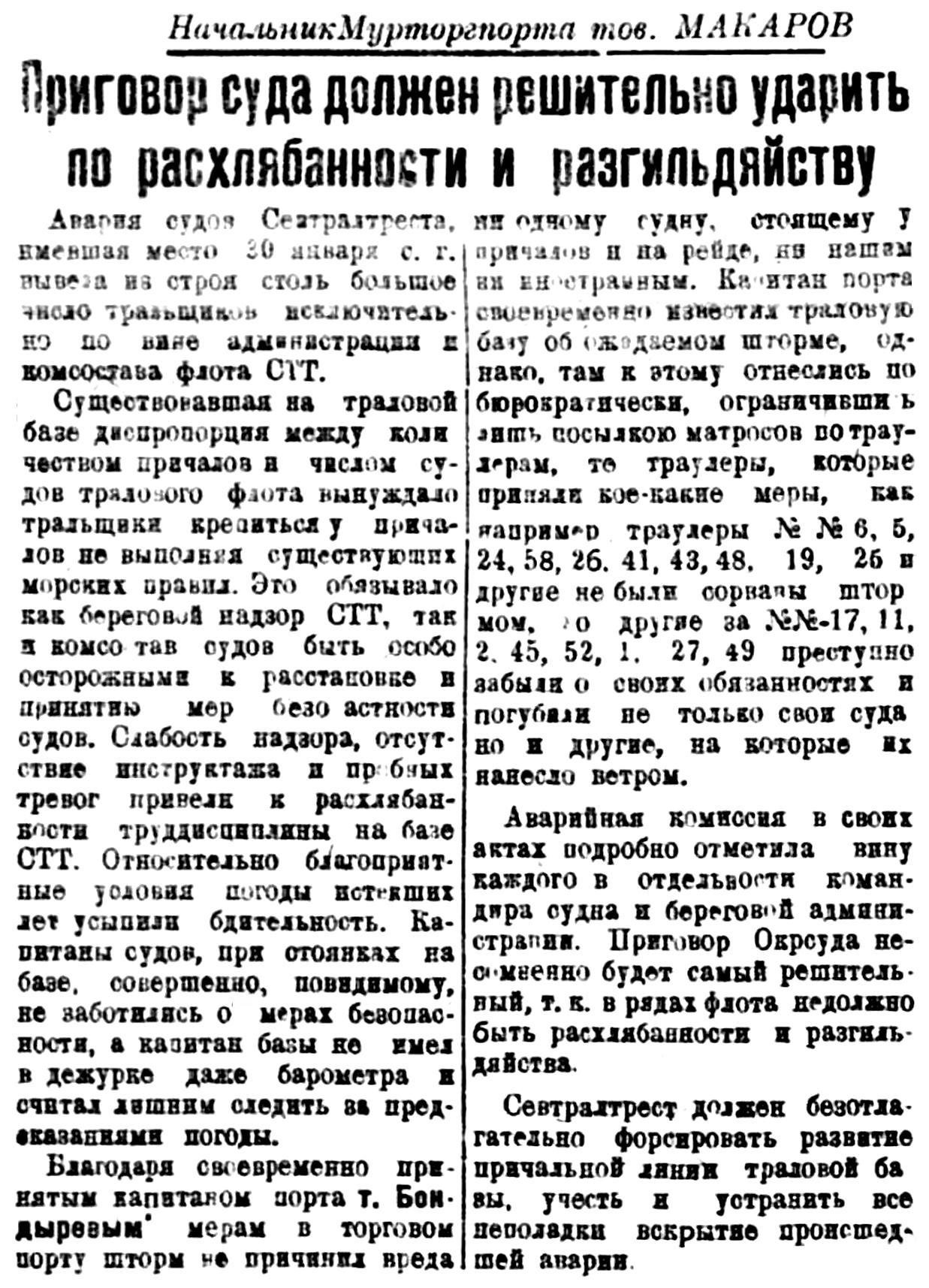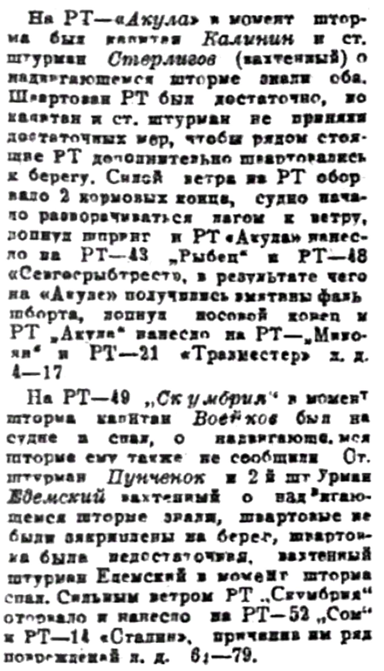 Аварии судов, а следовательно и тысячные убытки, можно было вполне избегнуть, если бы в траловом флоте существовала должная трудовая дисциплина. Еще в 4 часа дня, накануне шторма порт предупреждал траловую базу о падении барометра. Вторично в 11 часов вечера капитан порта Болдырев запрашивал, какие меры приняты в связи с надвигающимся штормом, на что был получен ответ, что к шторму суда готовы.
