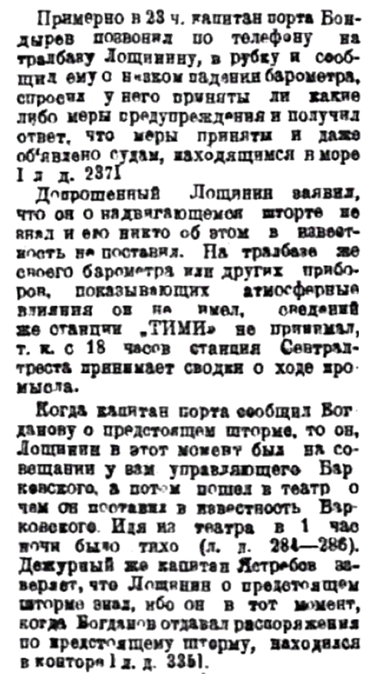 В 22 часа 30 мин. пришедший в бюро погоды зам. нач. бюро погоды старший синоптик Яковлев… при разговоре с дежурным синоптиком заявил: «Я боюсь, как бы не было шторма». На это Степанова ответила, что она точно так же этого опасается. Яковлев… на основании существующей инструкции о даче штормовых предупреждений обязан был подать сигнал шторма № 1, т. е. за 10-12 часов до начала такового. Не дав конкретных указаний… о необходимости поднятия штормовых сигналов, Яковлев в 23 часа покинул бюро погоды и пошел спать.
